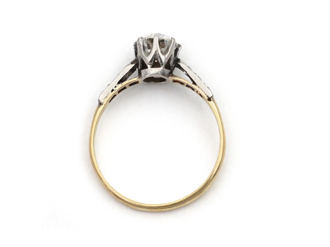 Antique 0.75ct diamond solitaire engagement ring in platinum and 18kt yellow gold. Centred with an estimated 0.75ct round Old European cut diamond in a raised platinum claw setting, flanked to either side with raised pointed shoulders embellished with eight cut diamonds in platinum grain settings, terminating to a smooth solid shank.