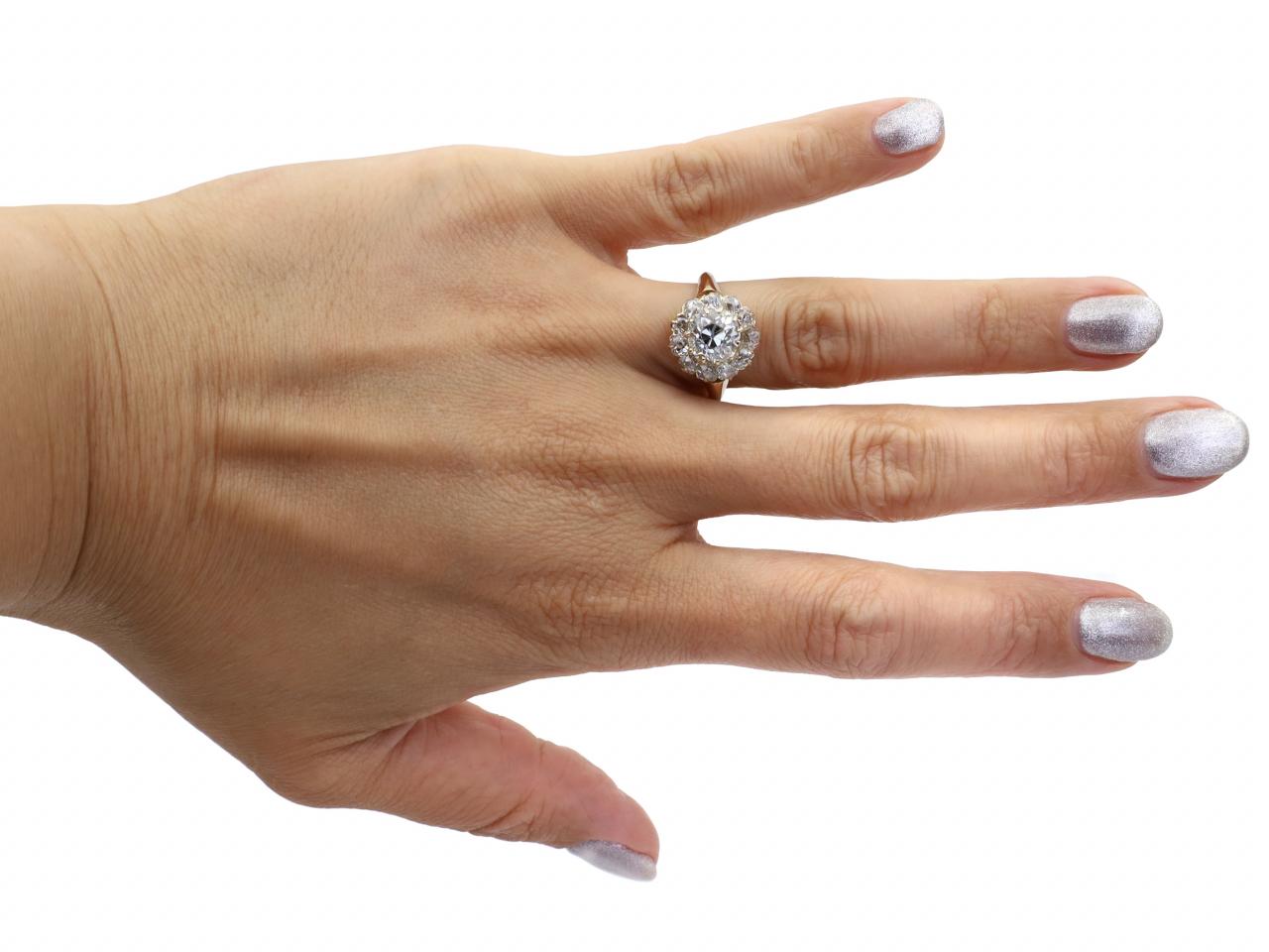 Antique 1.70ct Old Mine cut diamond centre coronet cluster ring in 18kt yellow gold. Centred with an estimated 1.70ct cushion shape Old Mine cut diamond in fine claw settings, encircled by a row of cushion shape Old Mine cut diamonds in claw settings, to a circular cluster, with curving claws, pierced gallery and fitted to either side with trumpeting champfered shoulders which taper and smoot to a solid shank.