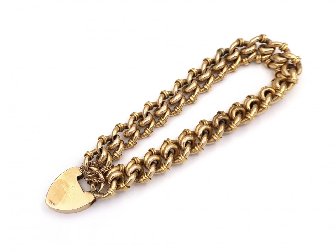 Antique 15kt yellow gold textured double curb bracelet and heart lock with safety chain.