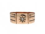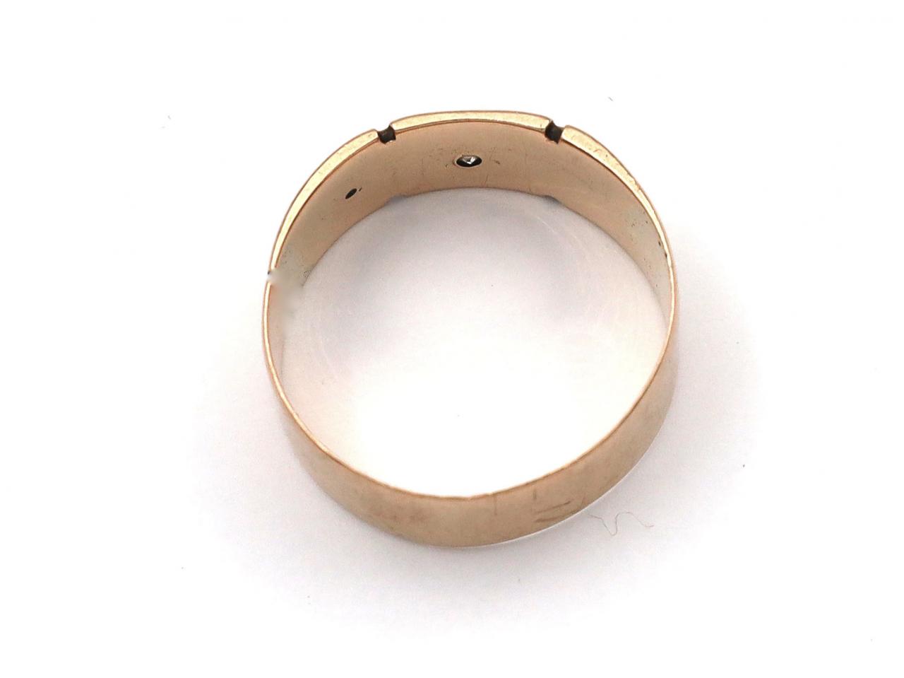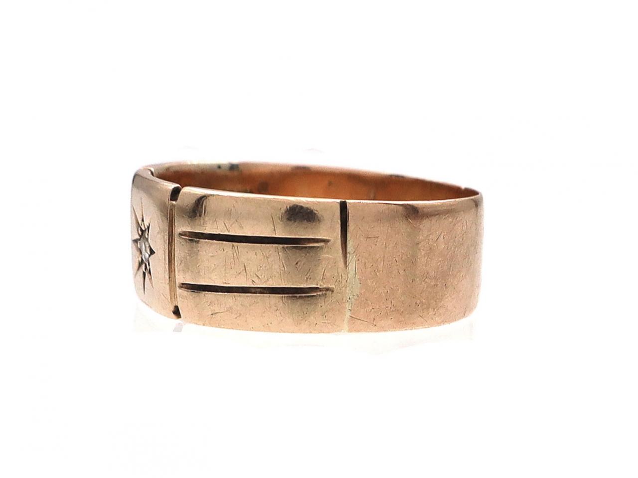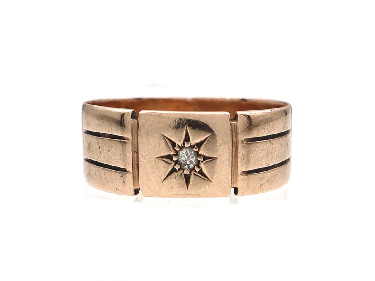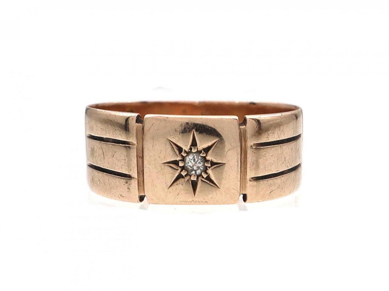 Antique 9kt rose gold and diamond star signet ring. Set with a cushion shape Old Mine cut diamond in a claw, eight pointed star setting, to a square plaque flanked to either side with incised vertical terminals and continuing to a broad ribbed shank.