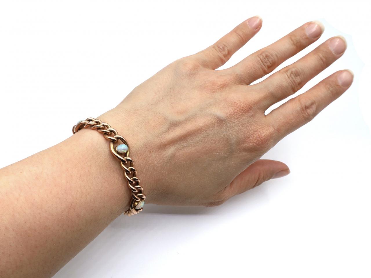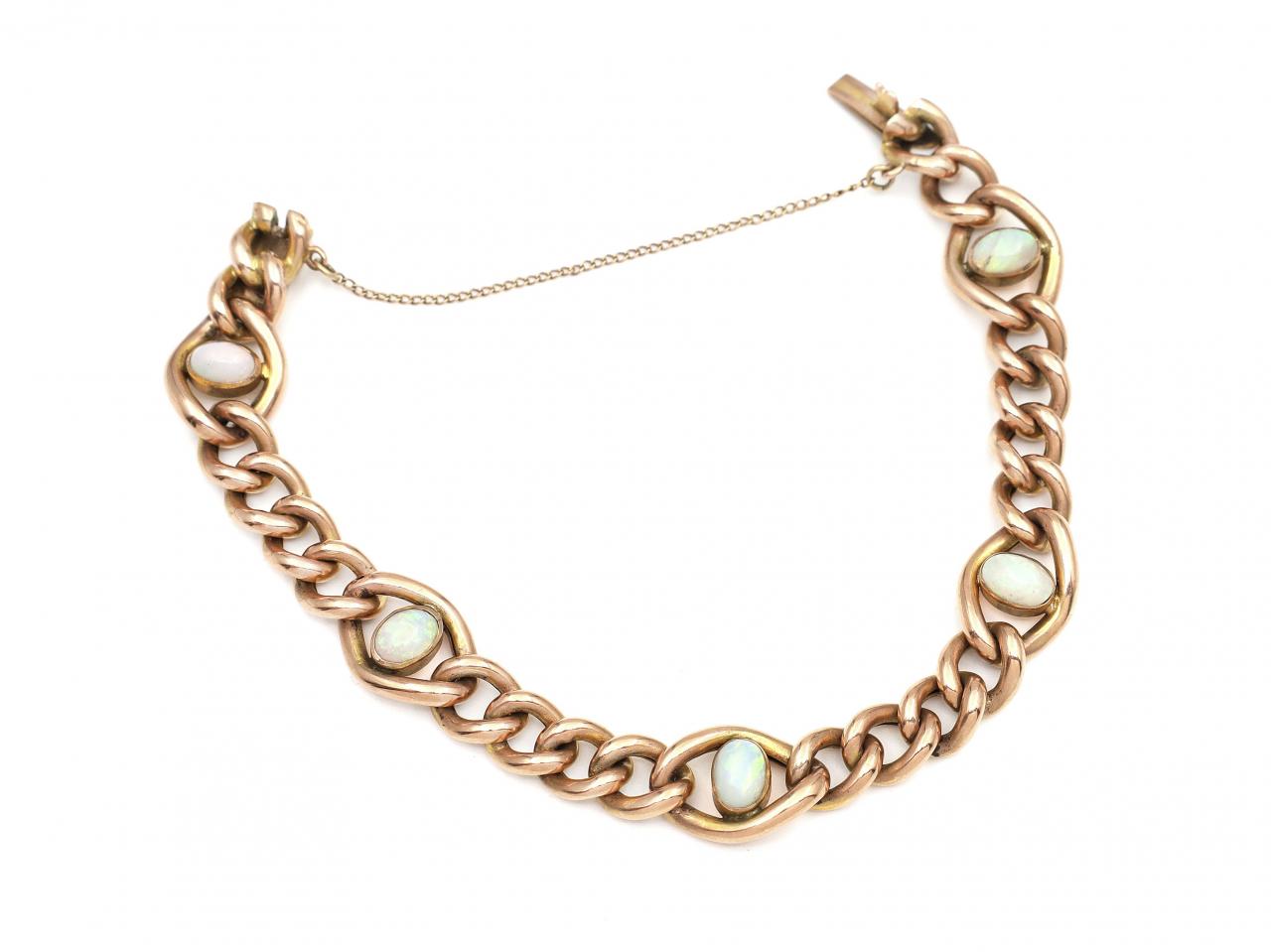 Antique 9kt rose gold and opal curb bracelet with safety chain.