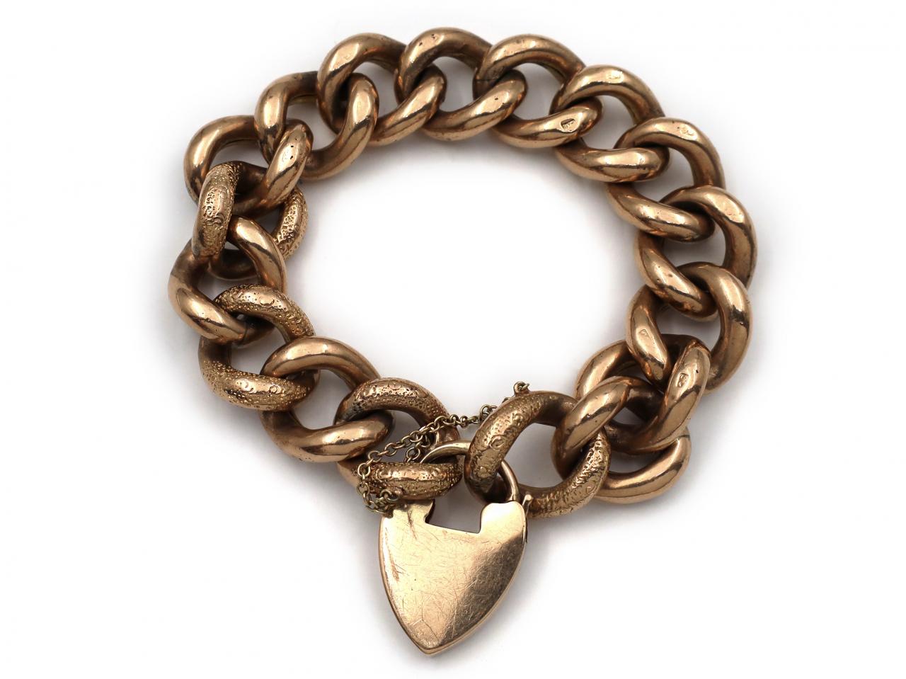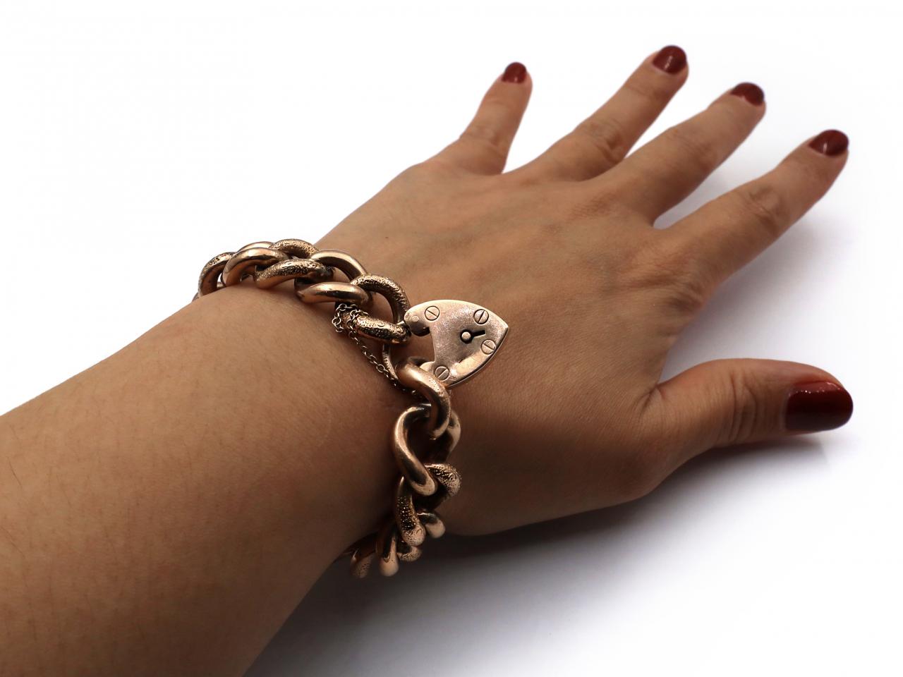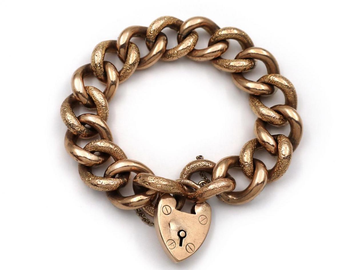 Antique 9kt rose gold textured curb bracelet with heart lock.
