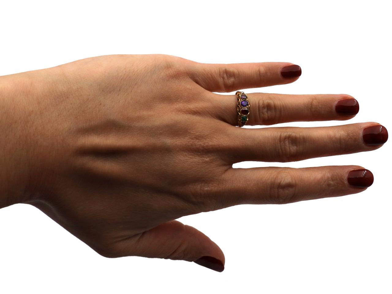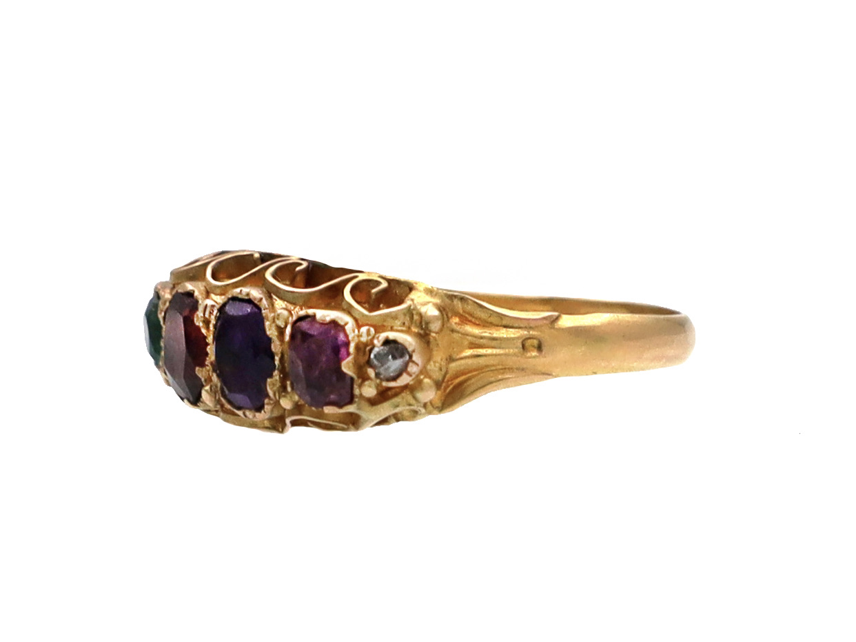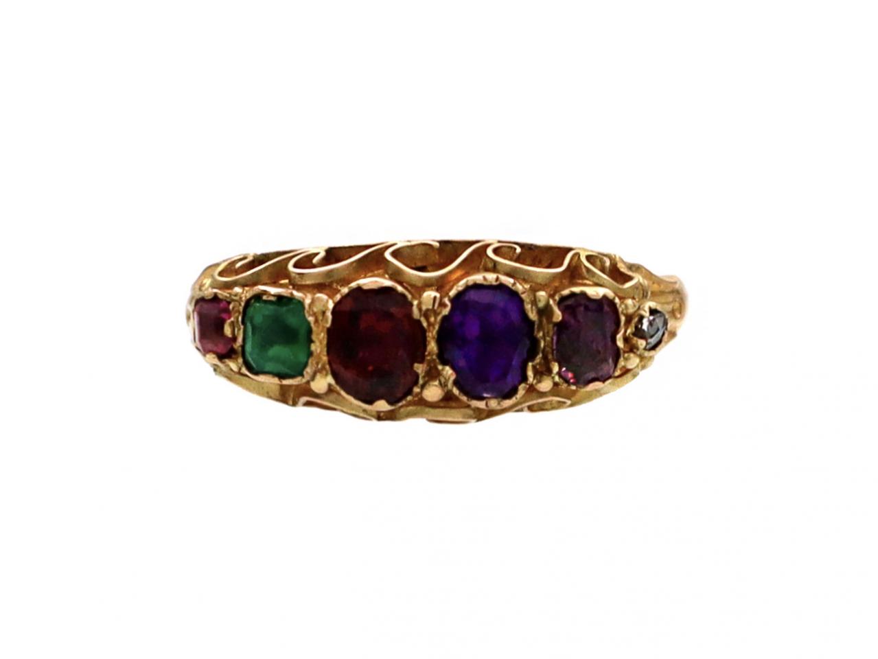 Antique acrostic 'REGARD' ring in 15kt yellow gold. Set across the finger with a cushion step cut ruby, octagonal emerald cut emerald, oval mixed cut garnet, oval mixed cut amethyst, cushion shape mixed cut rubelite and rose cut diamond all in cut down settings, to a graduating six stone design with stylised settings featuring curling wave motifs in relief and flanked by carved trumpeting shoulders which smooth to a matte shank. Hallmarked 15kt gold, Birmingham, 1865.