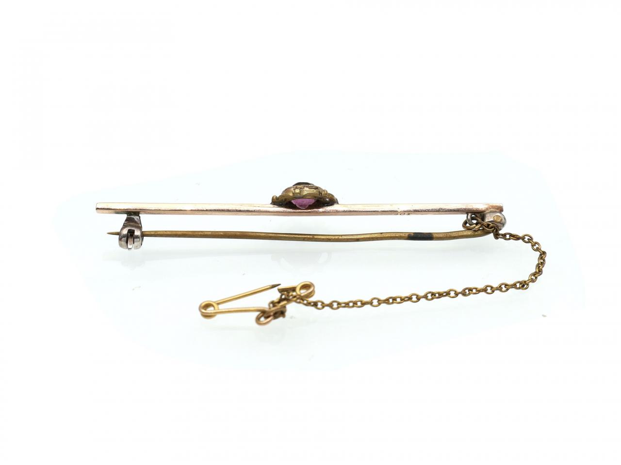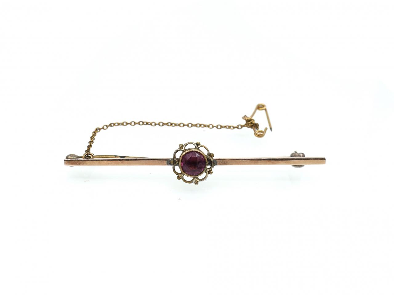 Antique amethyst bar brooch in 9kt rose gold, fitted with a safety chain.