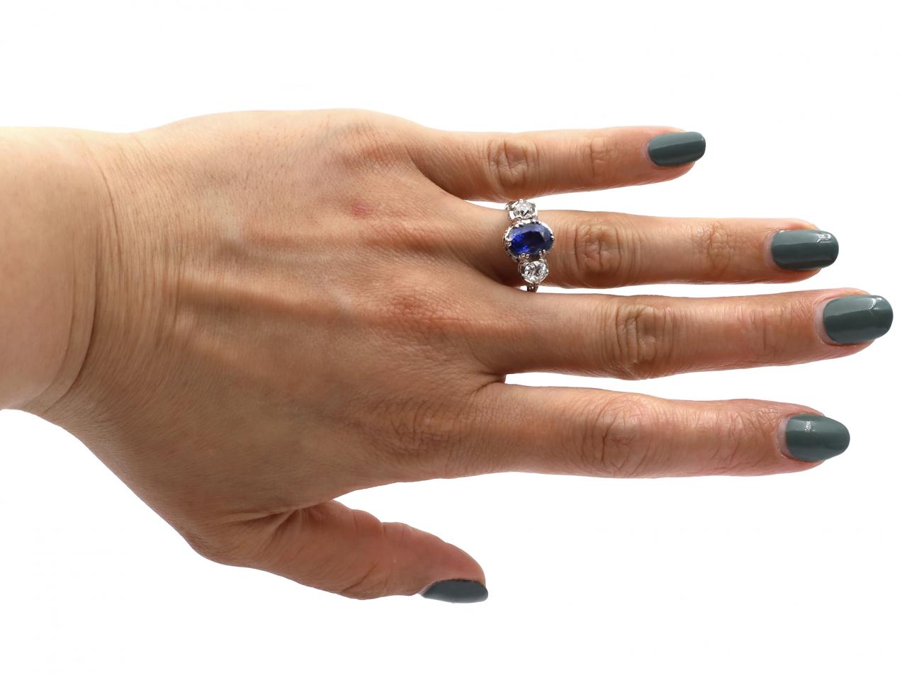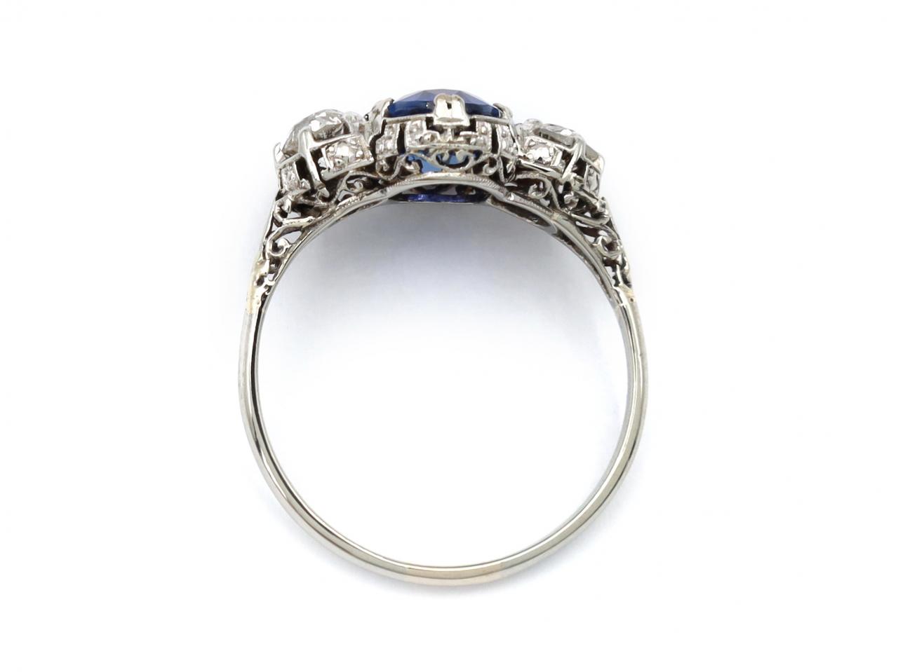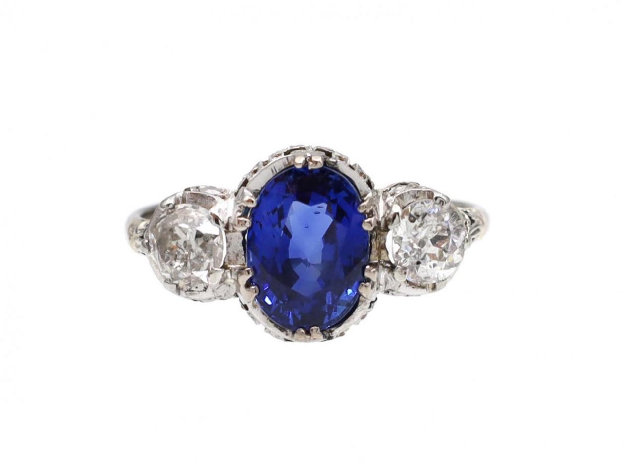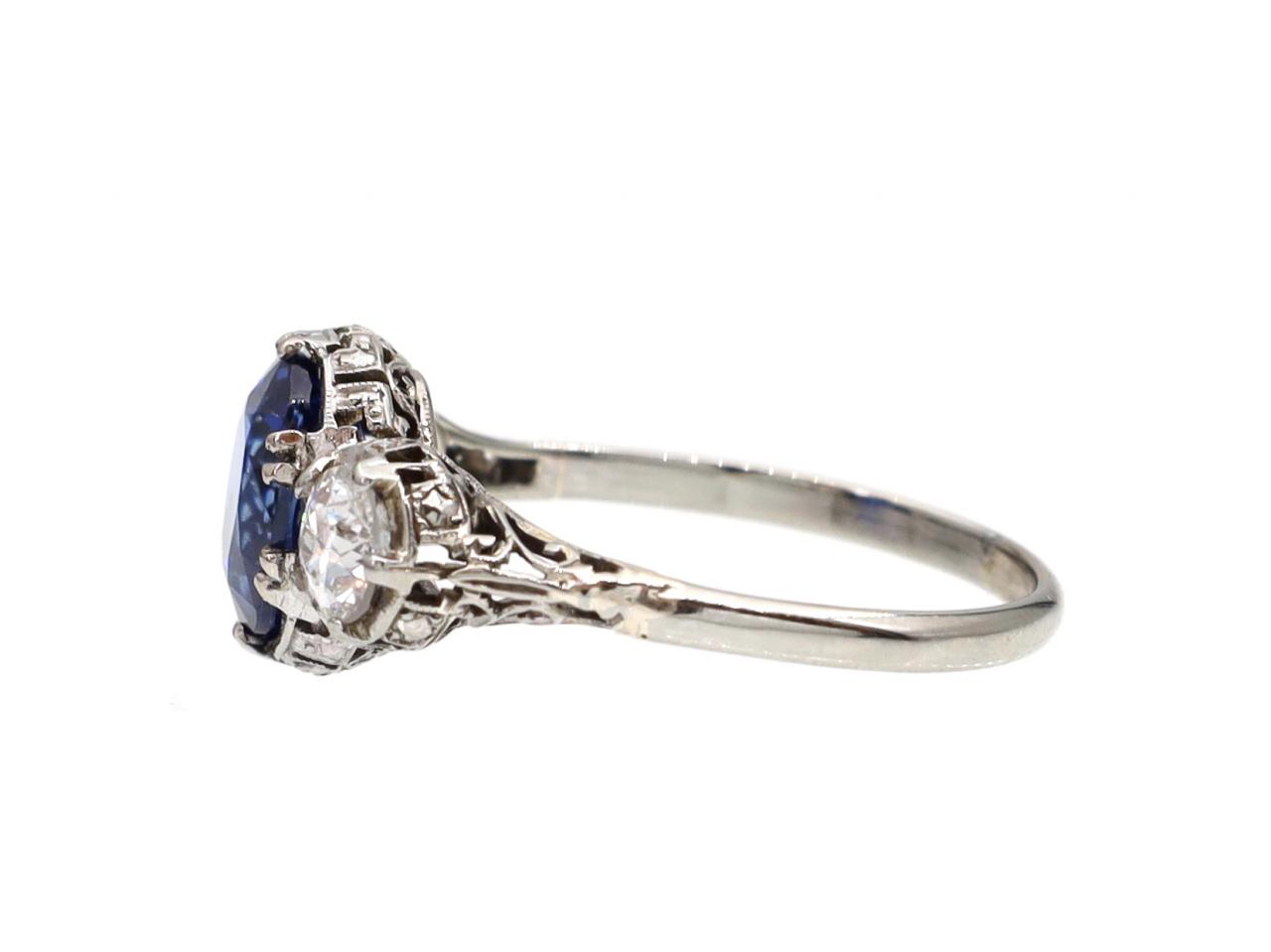 Antique Burmese sapphire and diamond three stone ring in platinum. Centrally set with an estimated 2.59ct oval mixed cut Burmese sapphire with no indications of heat treatment in a fancy split claw setting, flanked to either side with two cushion shape Old Mine cut diamonds in claw settings, to a graduating three stone design with bespoke claws, intricately pierced decorative gallery and flanked to either side with trumpeting shoulders featuring openwork scrolling before smoothing to a solid shank. Accompanied by GRS certificate.
