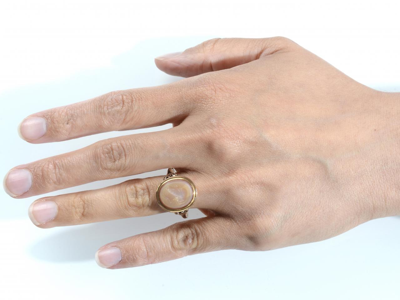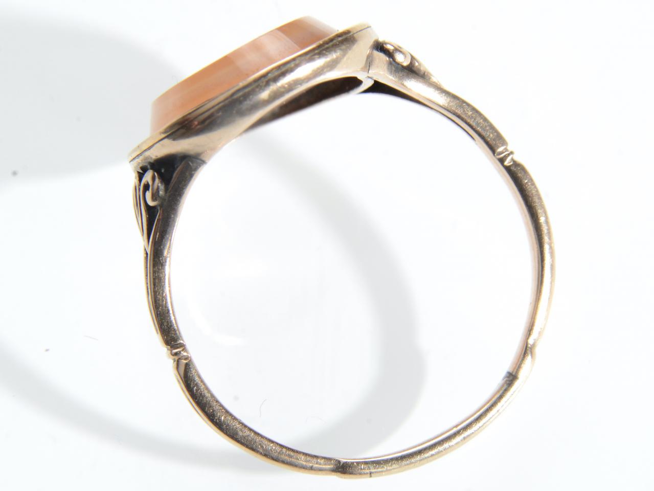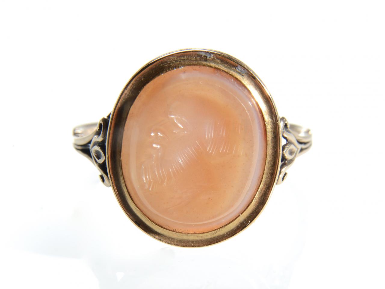 Antique carnelian ring with intaglio of a bearded man in 9kt yellow gold, centred with an oval tablet of carnelian in a rubover setting, flanked by elaborate trumpeting shoulders with pierced details continuing to a sectional shank with centred incised decoration.