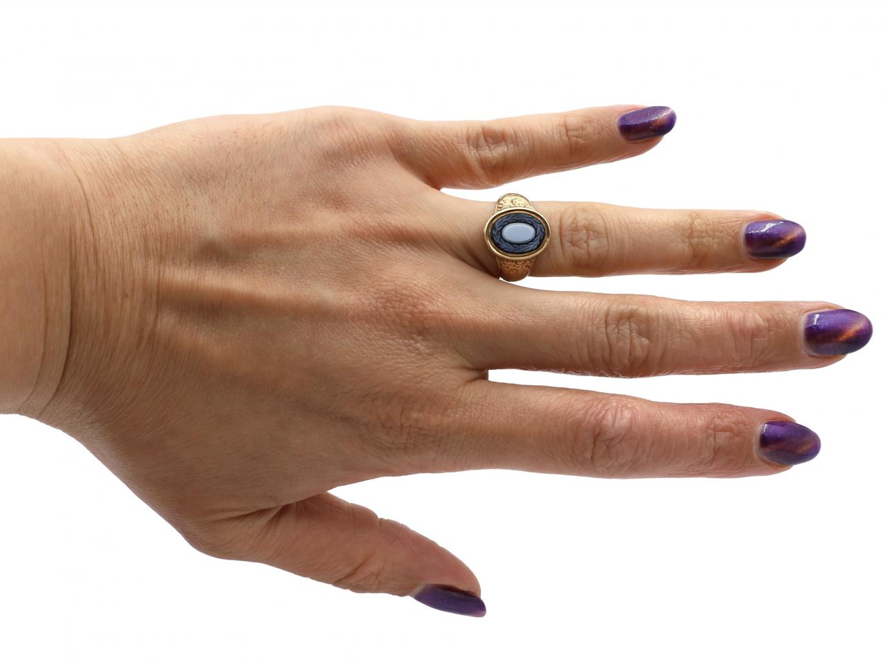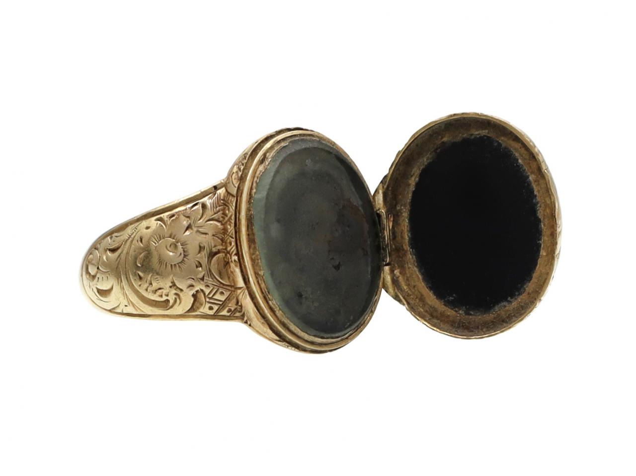 Antique carved banded onyx cameo wreath locket ring in yellow gold.