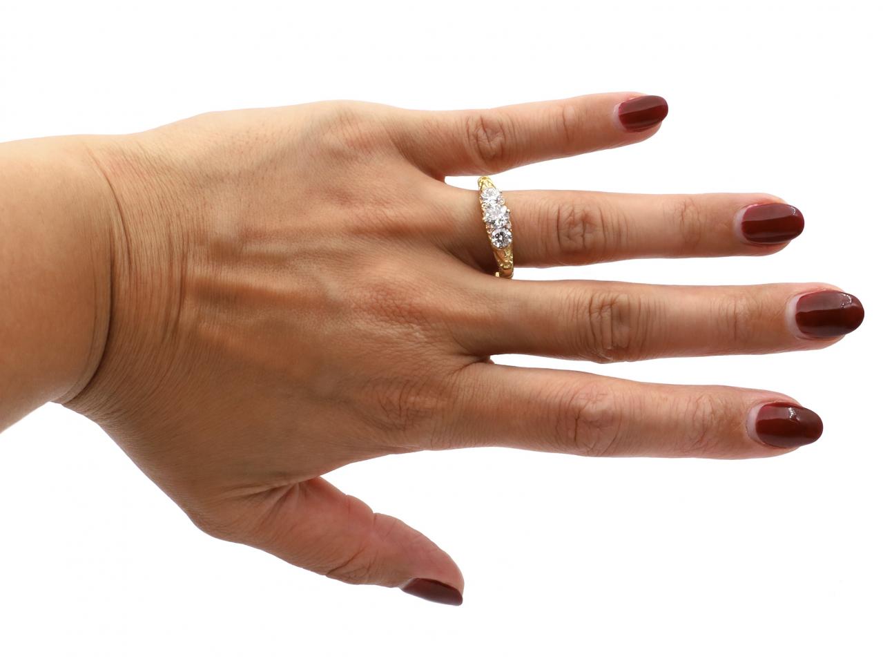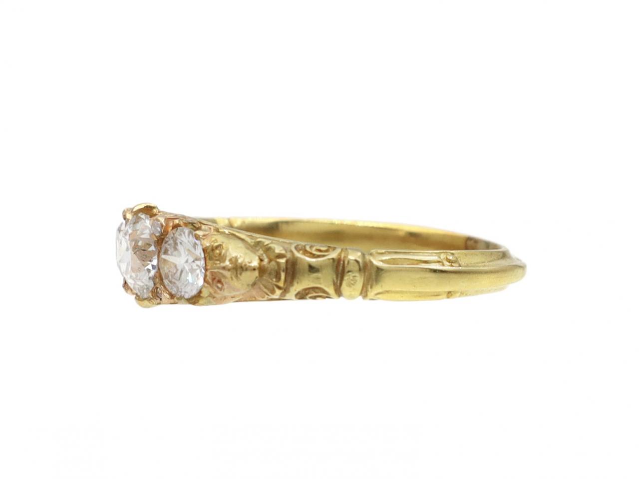 Antique carved faces diamond three stone ring in 18kt yellow gold. Set with three round Old European cut diamonds in claw settings, to a graduating three stone design with rose cut diamond embellishments, stylised claws, carved gallery and shoulders which feature incredibly detailed faces and curled scrolling before terminating to a stepped solid shank.
