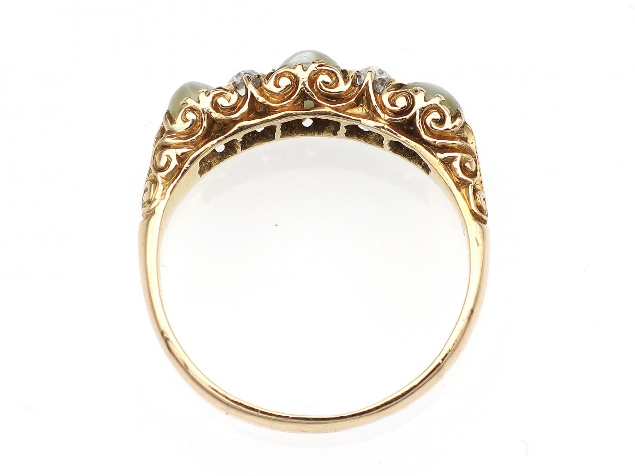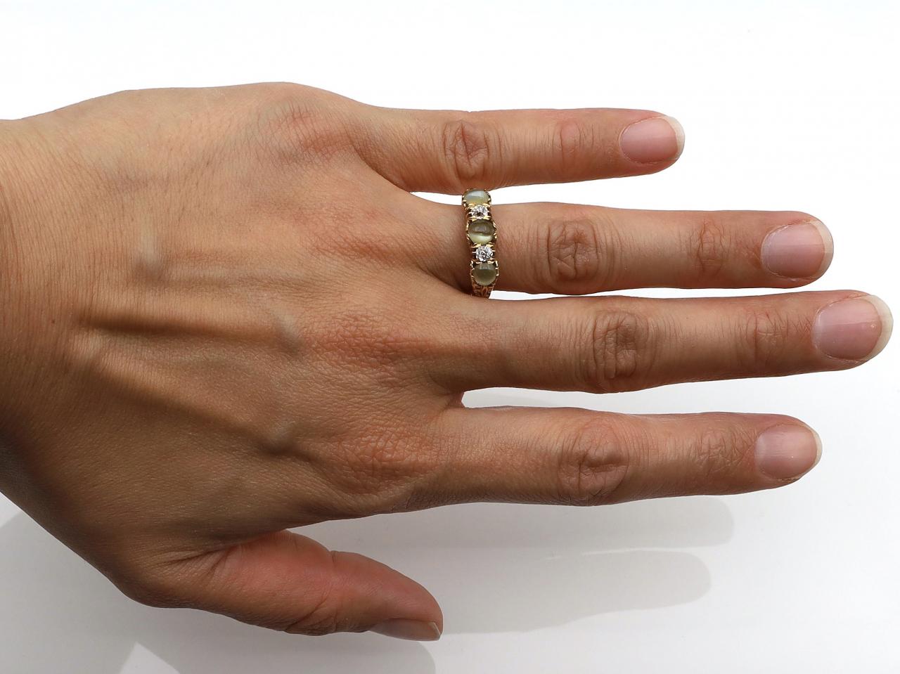 Antique cat's eye chrysoberyl and diamond carved ring in 18kt yellow gold. Set with three round cabochon cut cat's eye chrysoberyls in claw settings, alternating with cushion shape Old Mine cut diamonds in claw settings, to a five stone design with stylised claws, scrolling carved gallery which continued to the shoulders which tapered to a solid shank. Tested 18kt gold.