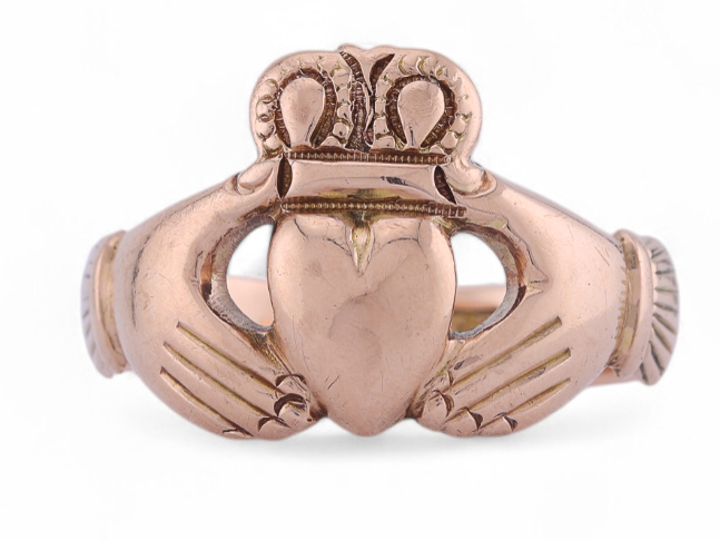 Antique Claddagh ring in 9kt rose gold. A classic Claddagh design, featuring a crowned heart held by two open hands, which taper to a solid shank. Hallmarked 9kt with the makers mark T.D
