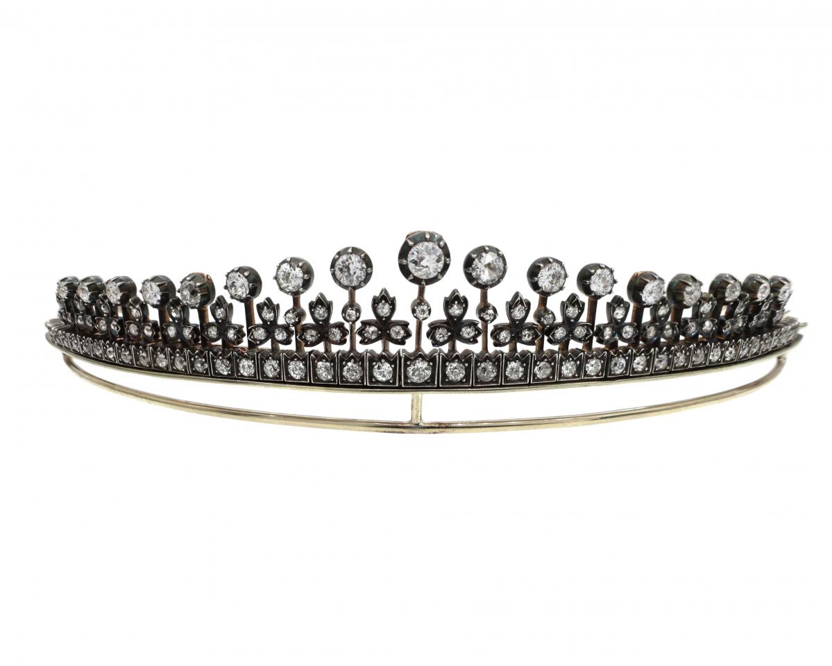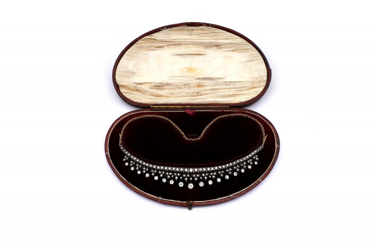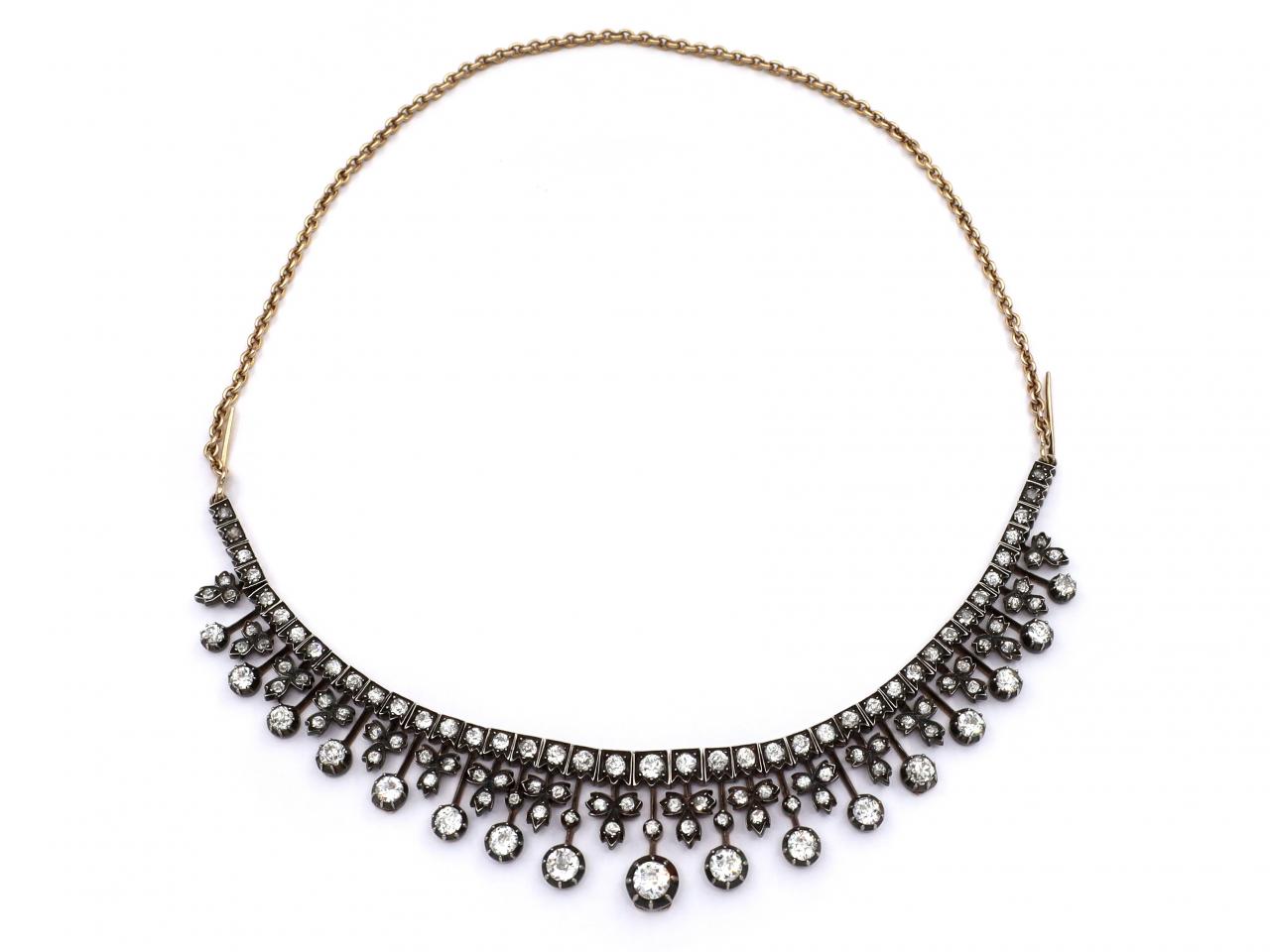 Antique convertible diamond set fringe necklace/tiara in silver and 18kt yellow gold. A graduating fringe necklace set with round Old European cut diamonds in silver cut down settings, embellished with trefoiled florrets set with round eight cut diamonds in silver garin settings, all suspended from a row of of collet set round Old European cut diamonds, terminating to either side with a removable 18kt yellow gold trace chain. Accompanied by original antique box.