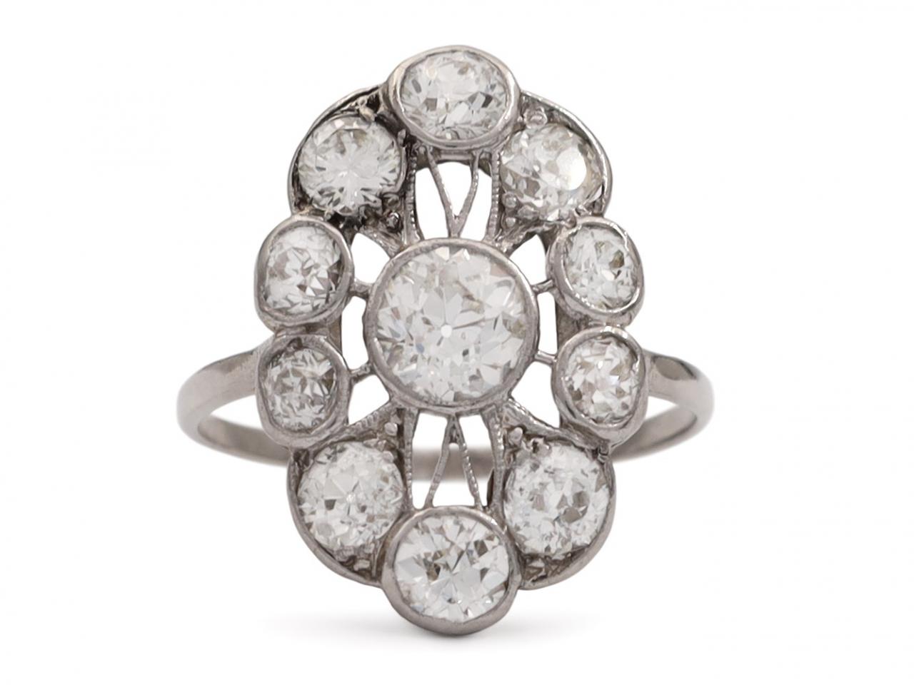 Antique diamond and platinum lace work oval cluster ring in platinum. Centred with an estimated 0.50ct round Old European cut diamond in a millegrain setting, surrounded by ten round Old European cut diamonds in millegrain settings, to an openwork oval cluster ring with linear lacework, structured gallery and flanked by intricate raised inwardly tapering shoulders which smooth to a slim shank. Estimated total diamond weight 1.60cts.