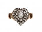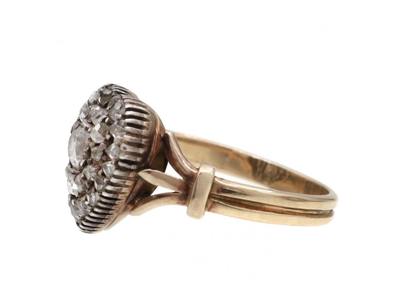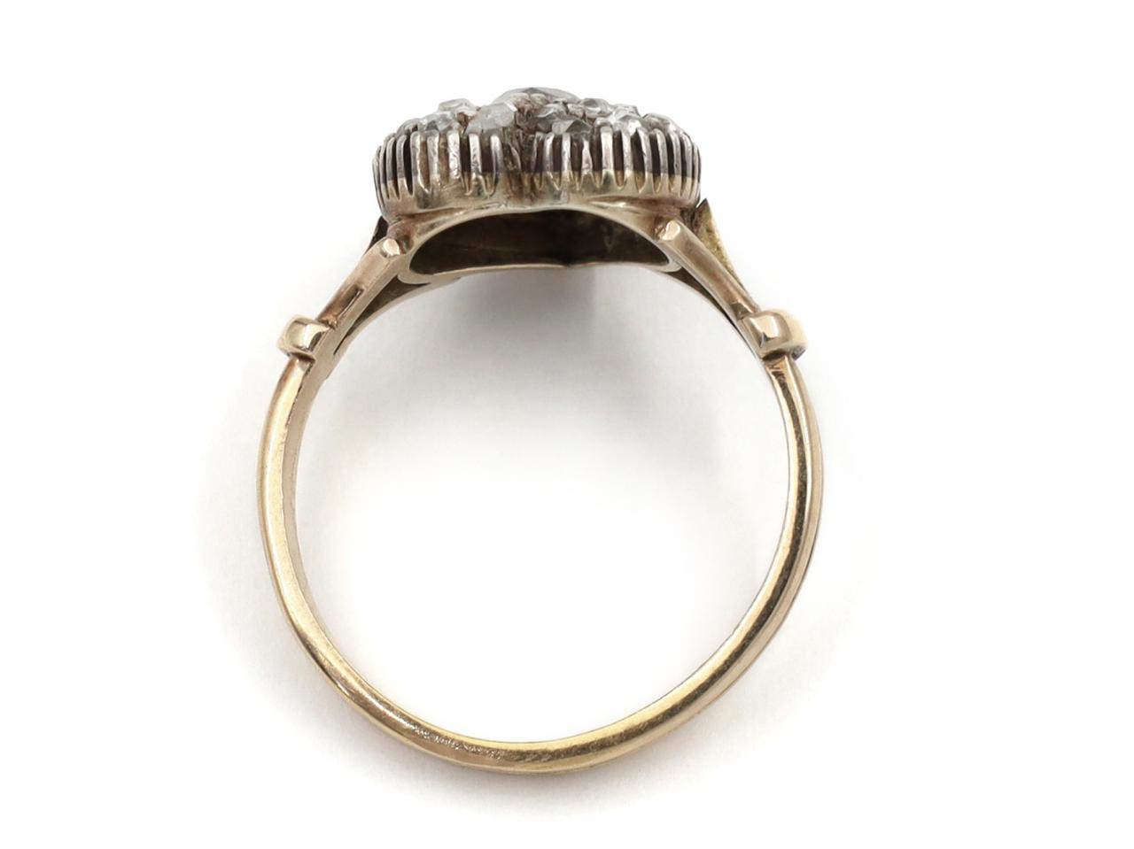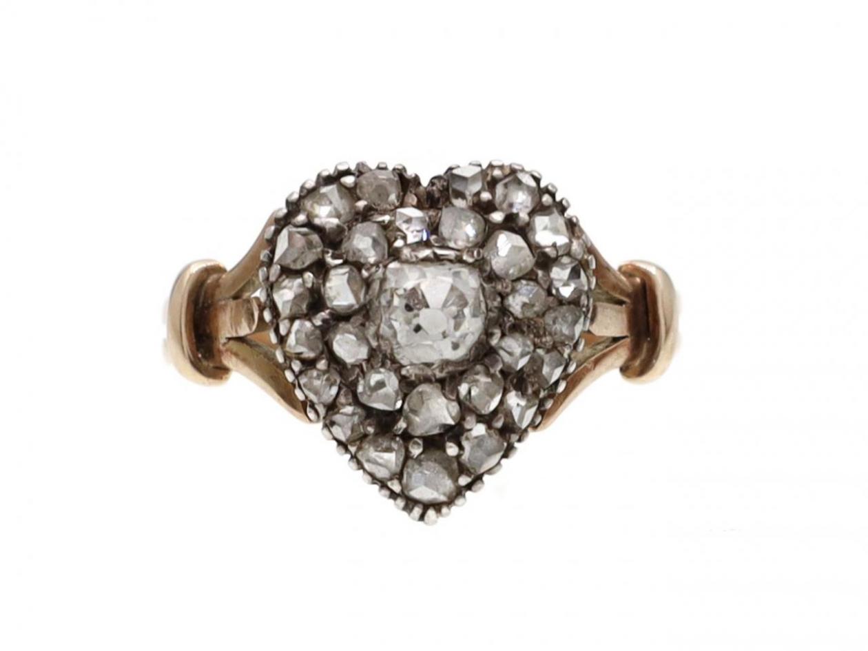 Antique diamond heart cluster in silver on 18kt yellow gold. Centrally set with a cushion shape Old Mine cut diamond in a silver cutdown setting, surrounded by two rows of rose cut diamonds in silver claw and grain settings, to a romantic heart cluster design with fine claws and tri-split shoulders with raised terminals and a solid ribbed shank.