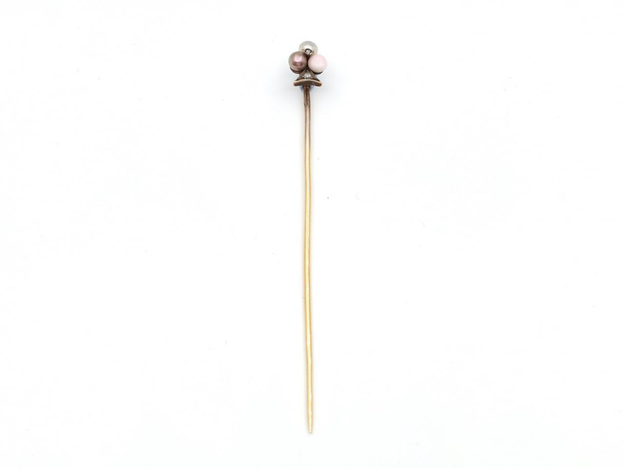 Antique diamond pearl and coral trefoil stick pin in silver and gold. Set to top with a white and black pearl and a coral bead in the form of a trefoil, embellished with rose cut diamonds in silver settings and fitted to reverse with a secure pin.