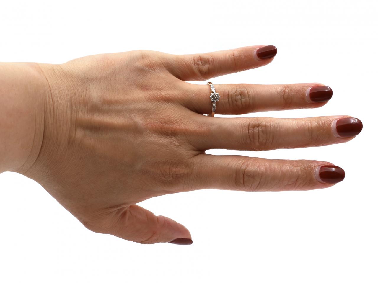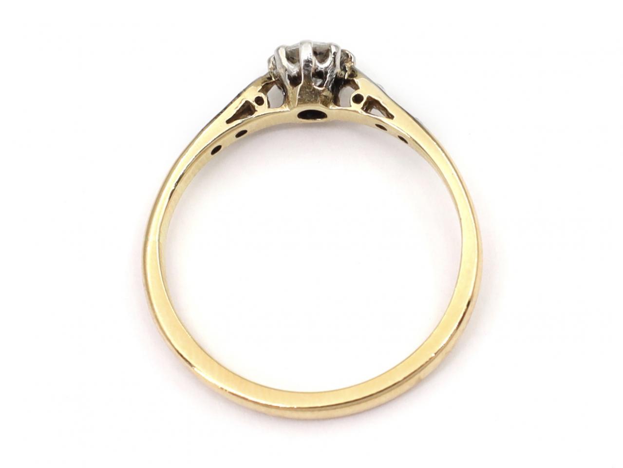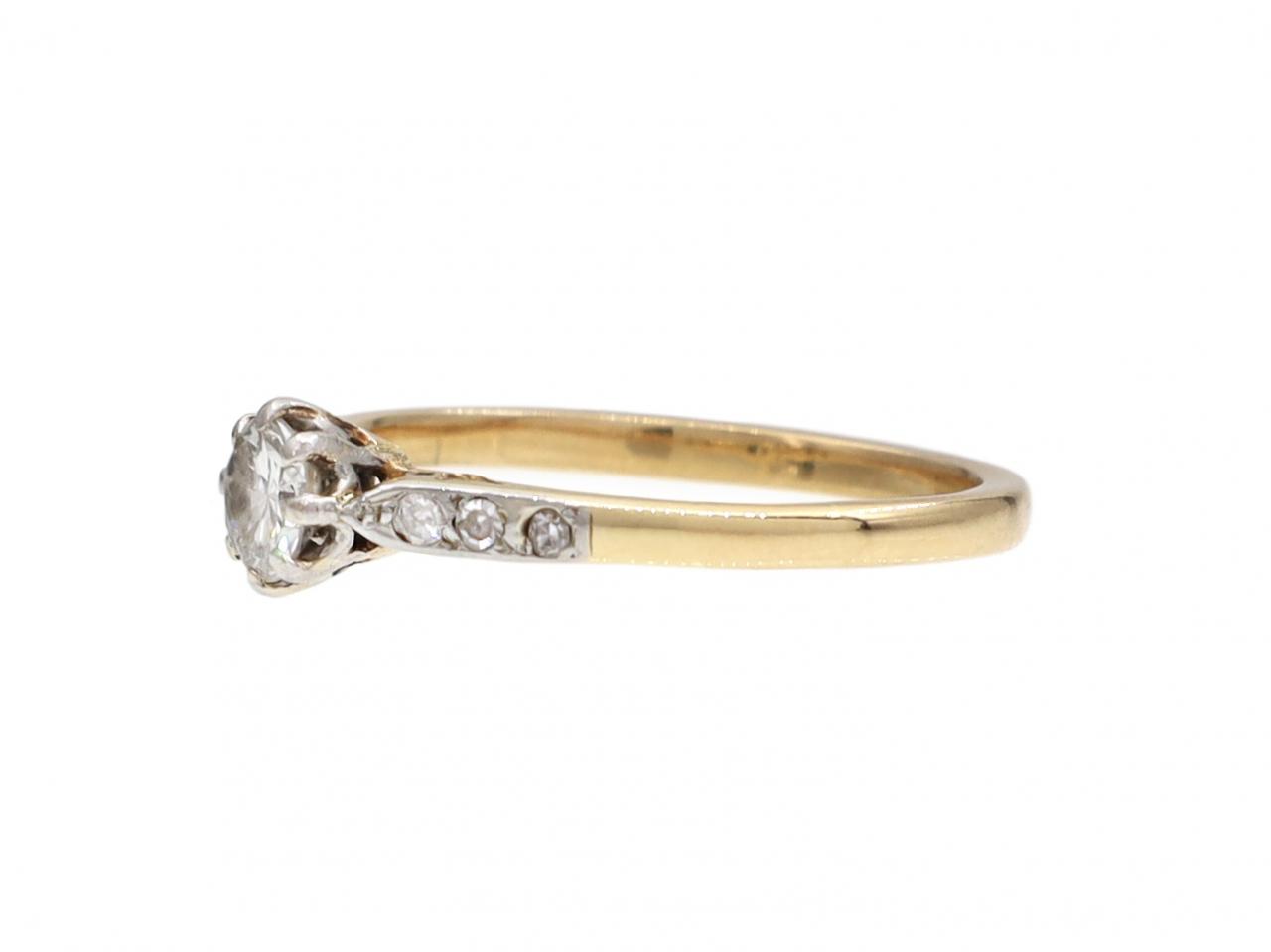 Antique diamond solitaire engagement ring in 18kt yellow gold. Centrally set with a round Old European cut diamond in a claw setting, flanked to either side with raised inwardly tapering shoulders set with six round old cut diamonds in grain settings, supported by cheniers and terminating to a solid shank.