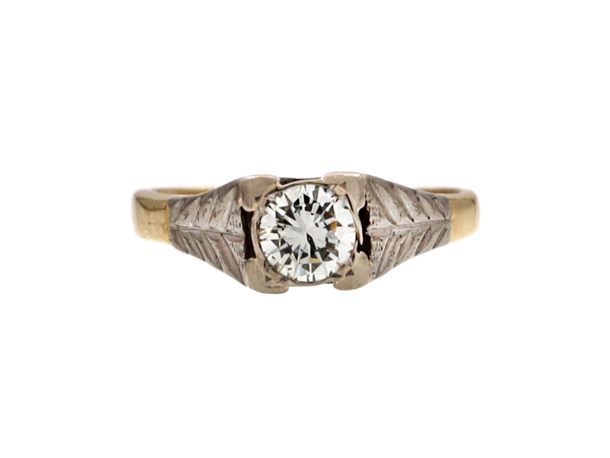 Antique diamond solitaire engagement ring with leaf motifs in platinum and 18kt yellow gold. Set with a 0.35ct round Old European cut diamond in a pleatinum square collet setting, to a decorative solitaire design with pierced collet, flanked by raised trumpeting shoulders in platinum with engraved leaf motifs, terminating to a solid shank.