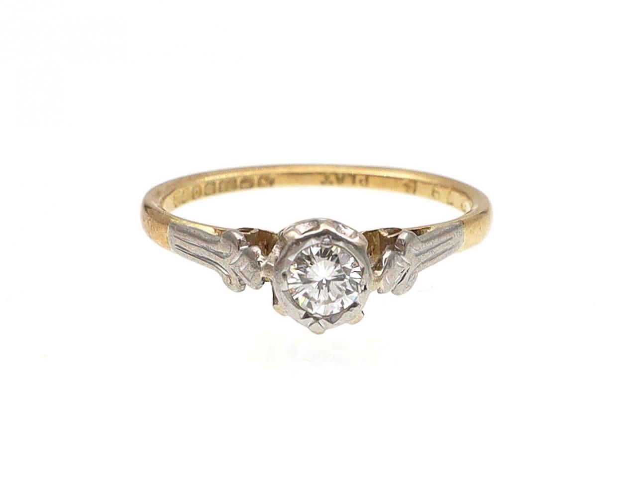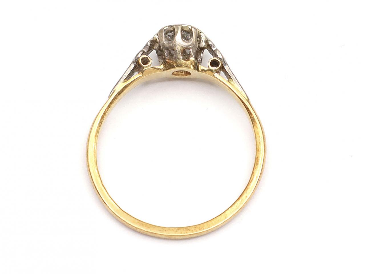 Antique diamond solitaire ring with fleur de lis shoulders in platinum and 18kt yellow gold. Centrally set with a 0.25ct round Old European cut diamond in a platinum illusion setting, to an elegant solitaire design with a raised circular collet with pierced linear gallery and flanked to either side with raised platinum shoulders in the form of fleur de lis motifs and supported by cheniers, ternminating to a slim shank. Hallmarked 18kt gold, Birmingham.