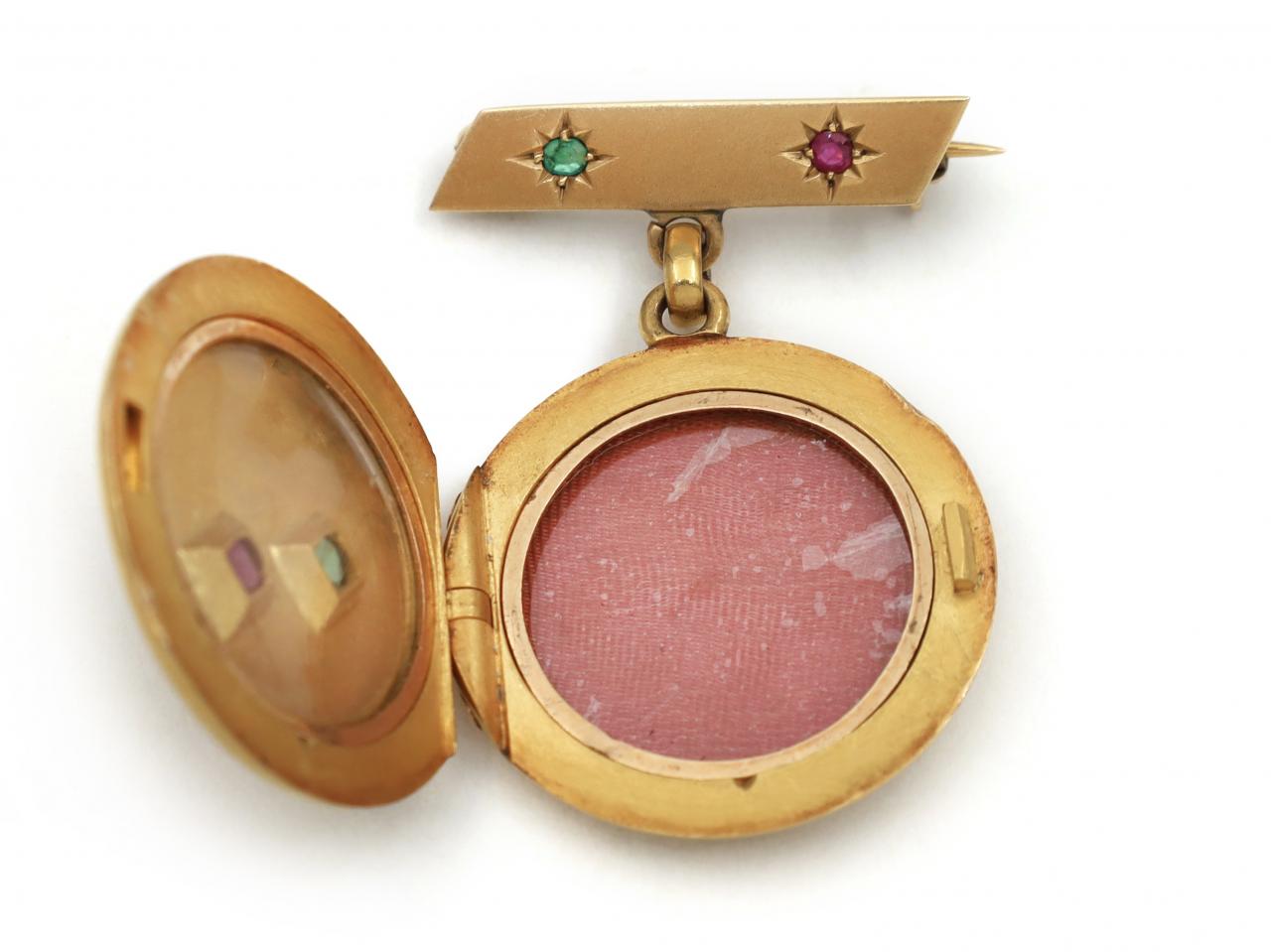 Antique emerald and ruby circular locket brooch in 18kt yellow gold. A flat parrallelogram bar brooch set with a round mixed cut emerald and ruby in star gypsy settings, fitted to the reverse with a hinged pin and C-scroll, suspending from the centre a circular locket decorated to the front with two shooting stars, one set with a round mixed cut emerald and the other set with a round mixed cut ruby, fitted to the side with a hinge and opening to reveal two compartments for keepsakes.