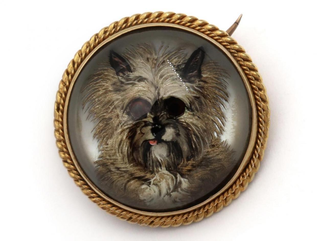 Antique Essex crystal terrier dog brooch in yellow gold.