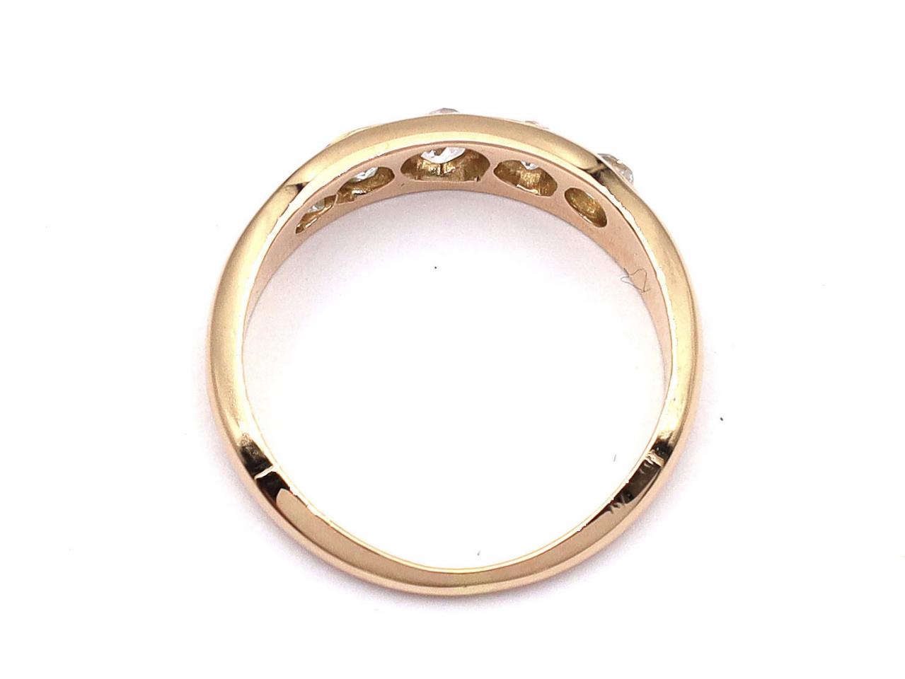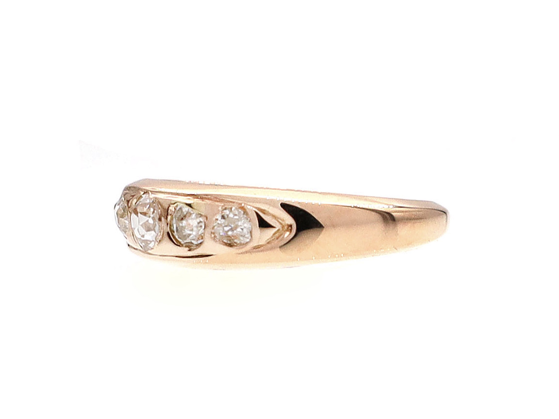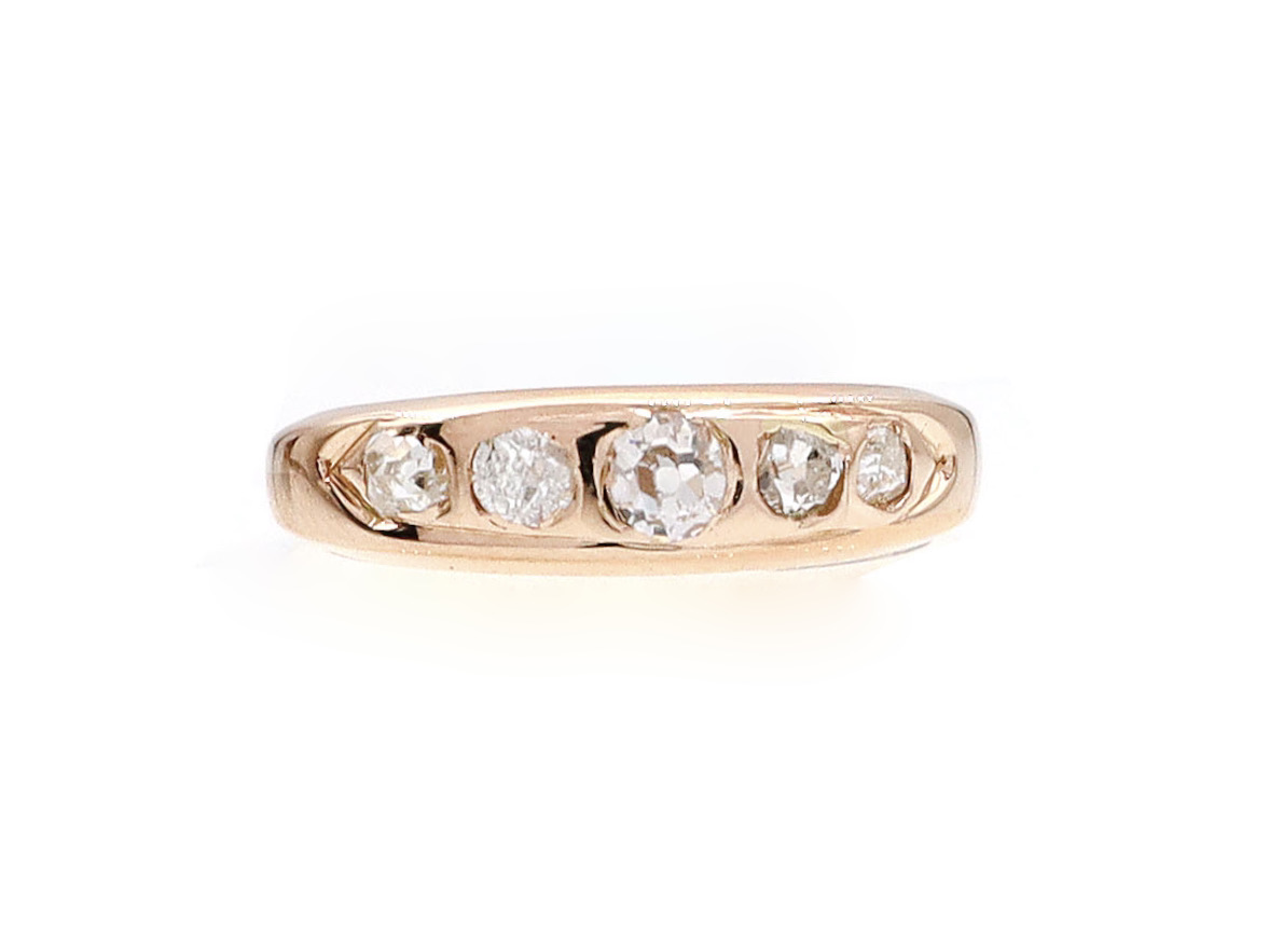 Antique five Old Mine cut diamond ring in 18kt rose gold. Set with five graduating cushion shape Old Mine cut diamonds in rubover settings, all to an integrated shoulder which curves to a solid shank.