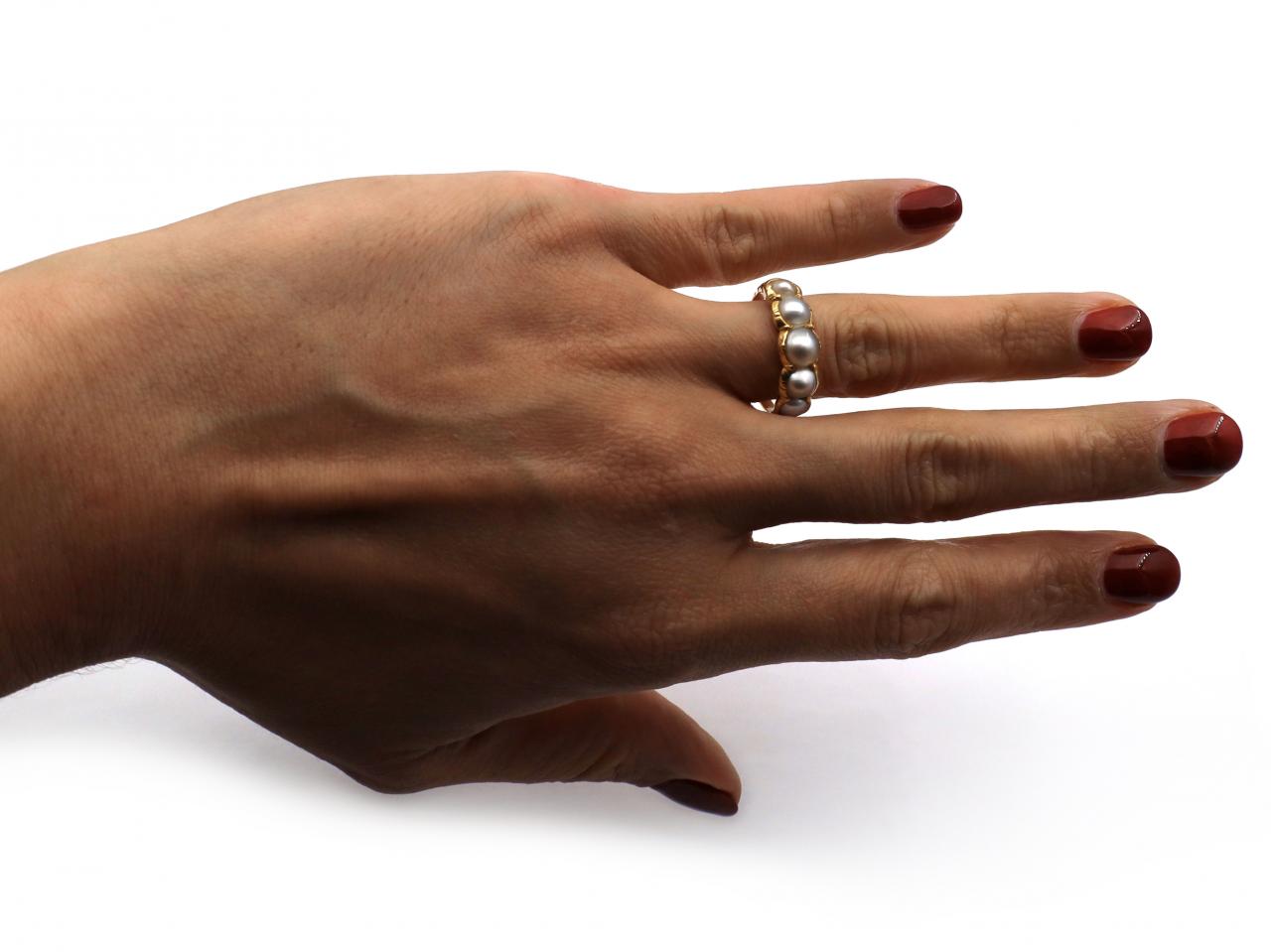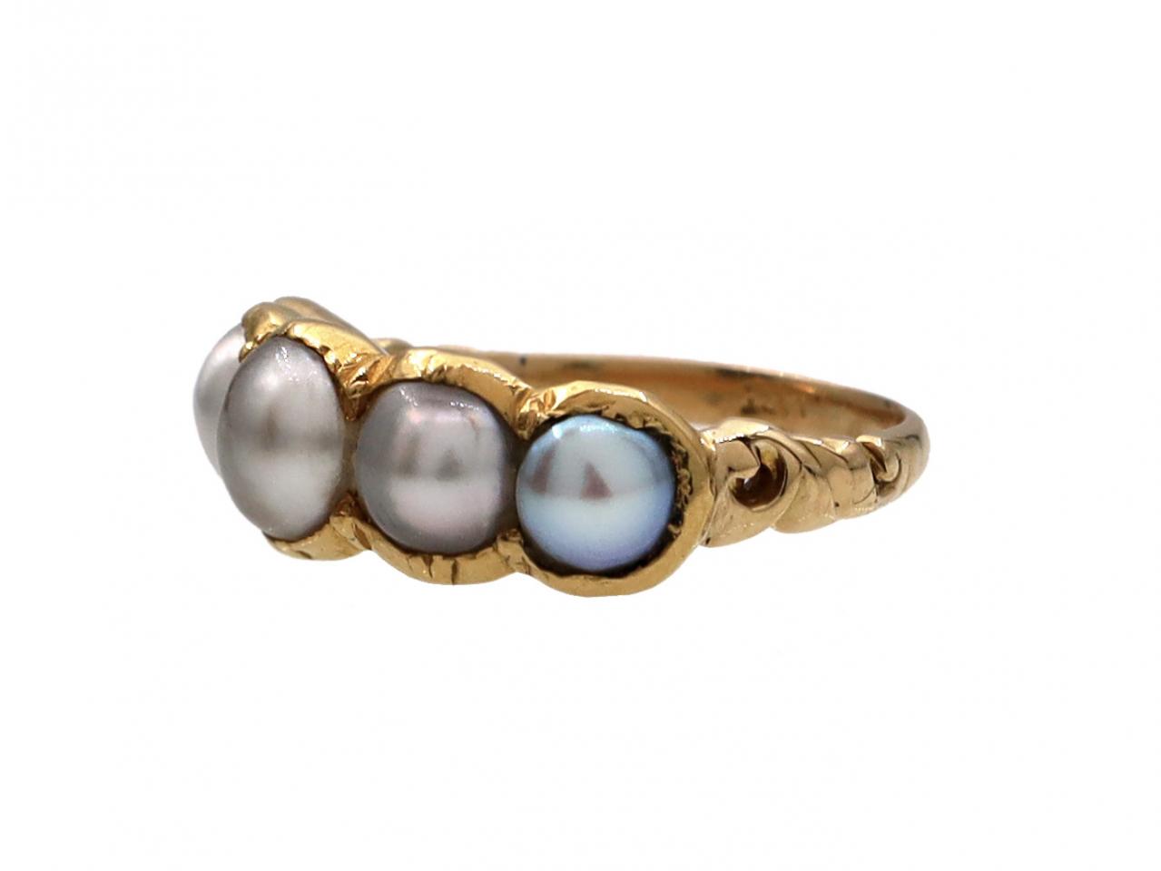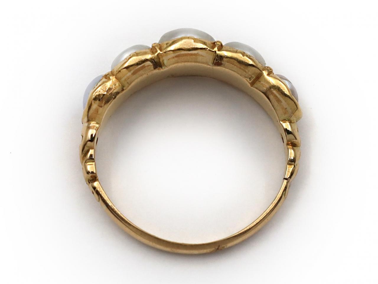 Antique five stone pearl ring in 18kt yellow gold. Set across the finger with five natural pearls in cutdown settings, to a graduating five stone design with decorative shoulders which terminate to a solid shank. Marked 18kt gold.