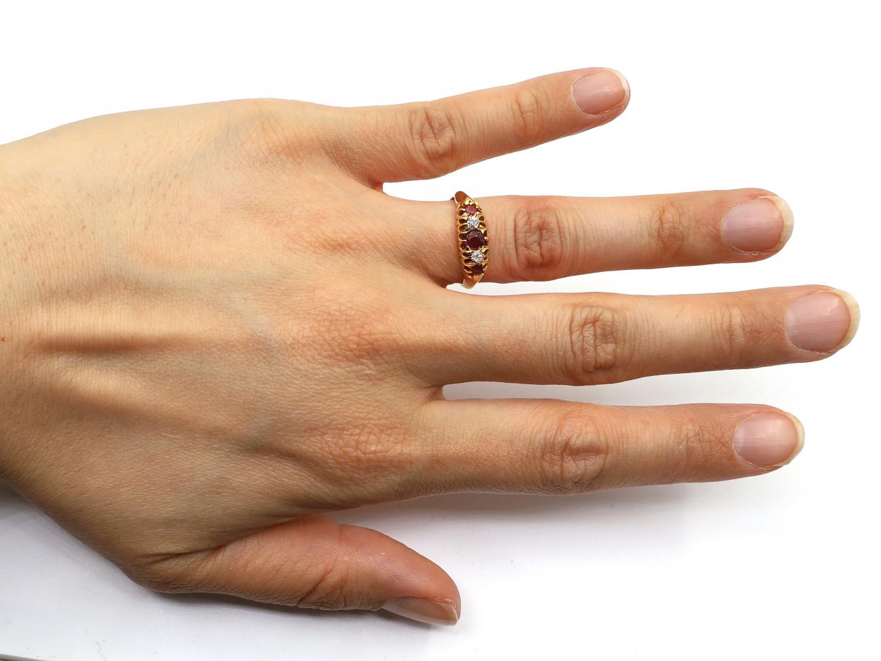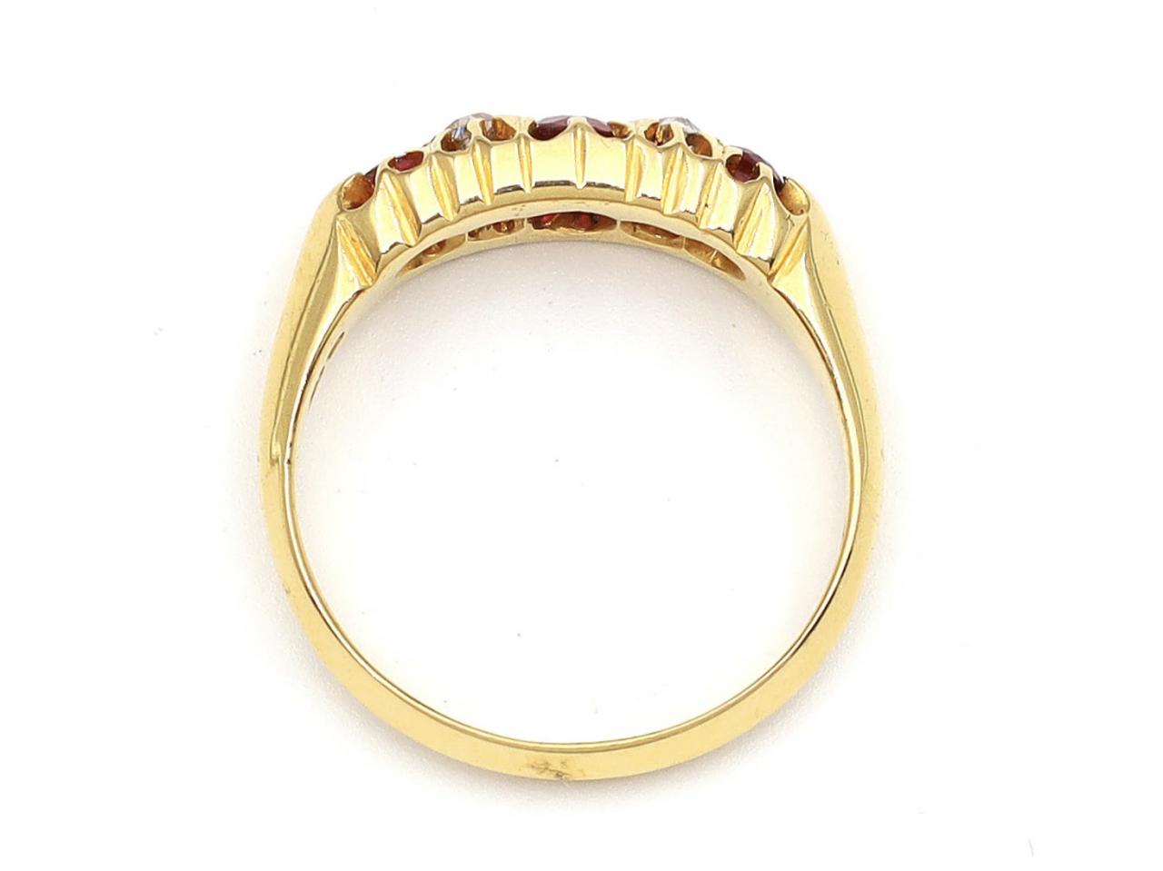 Antique five stone ruby and diamond ring in 18kt yellow gold. Set with alternating round mixed cut rubies and round old cut diamonds in claw settings, to a graduating five stone design with curving claws, ribbed gallery and flanked by integrated shoulders which taper to a solid shank. Hallmarked 18kt gold.