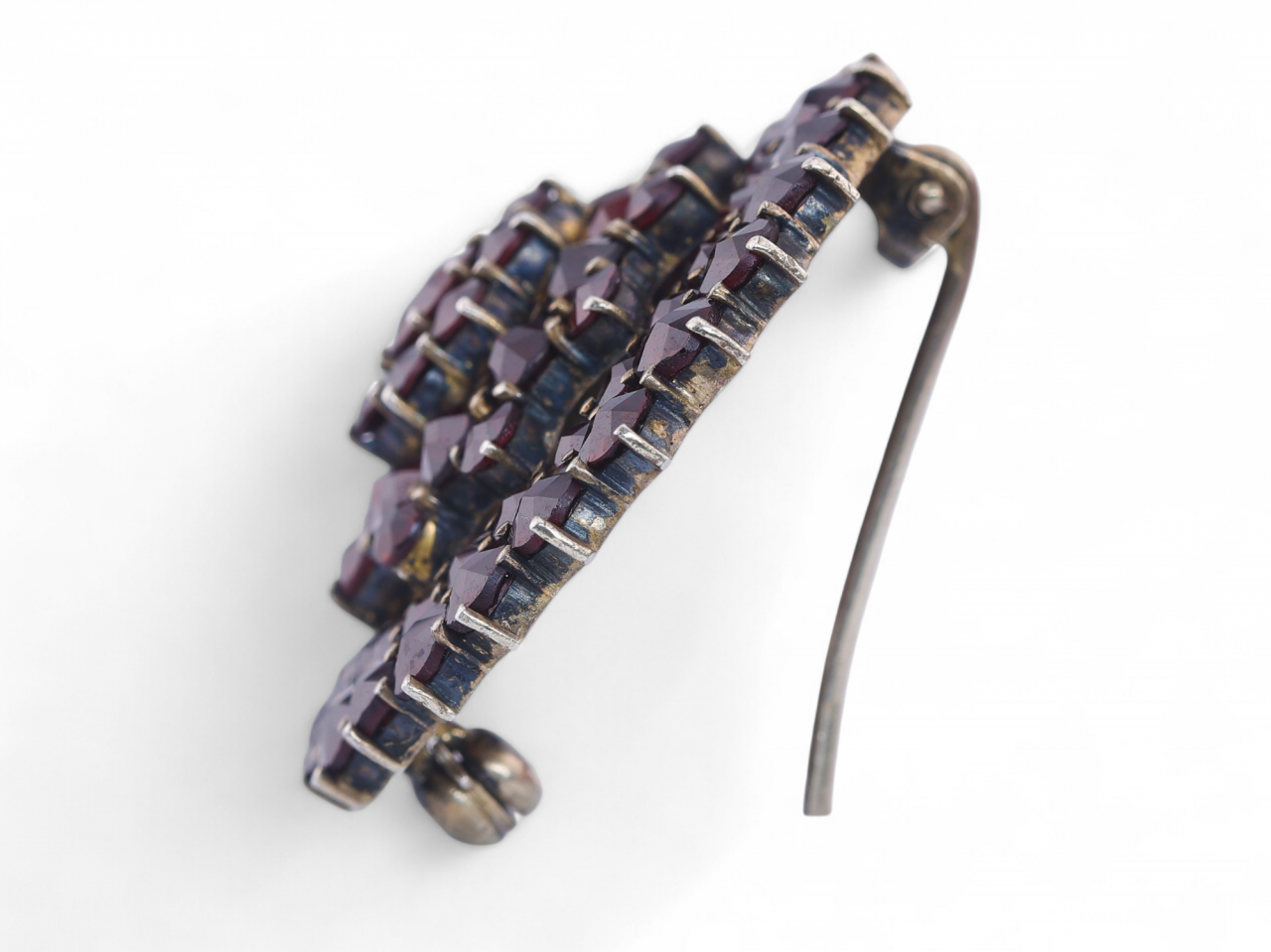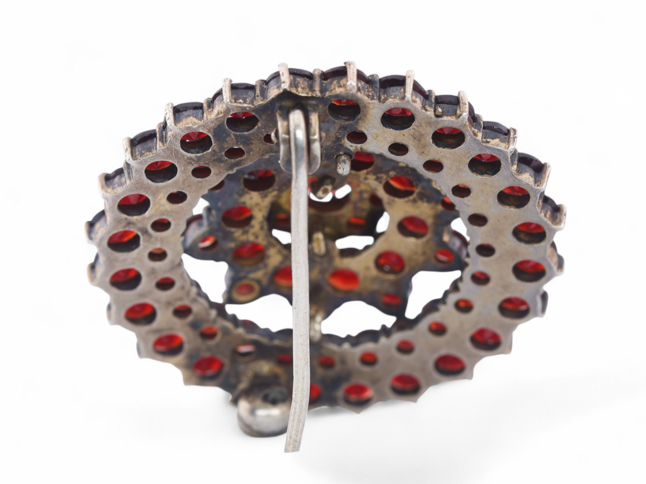 An antique circular cluster brooch set throughout with closely graduated rose-cut garnets in a tiered domed arrangement. Mounted in silver with gilt finish and fitted with a pin and secure clasp to the reverse.