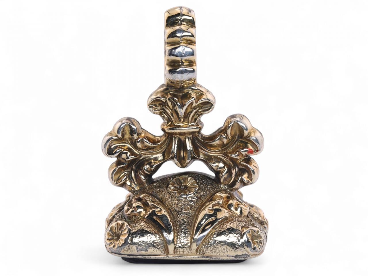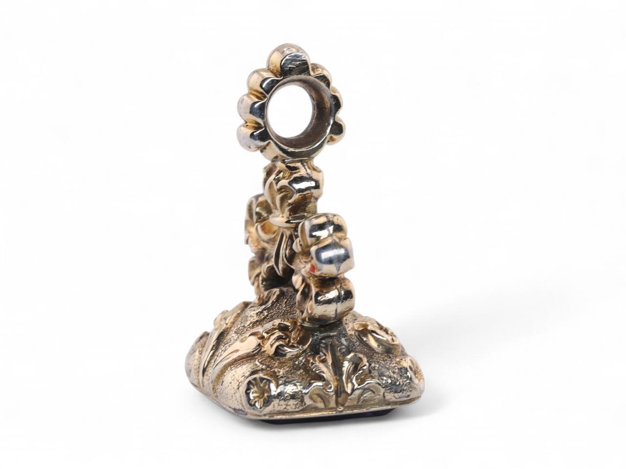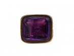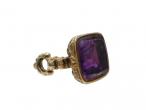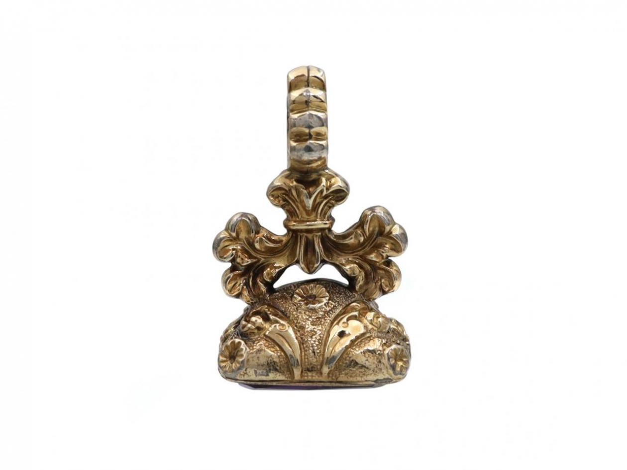 Antique fob set with an amethyst. An ornate fob pendant decorated with textured and chaised details featuring pretty floral motifs and deep incised ridges fitted to the base with a cushion shape tablet of amethyst. Tested as 14kt gold.