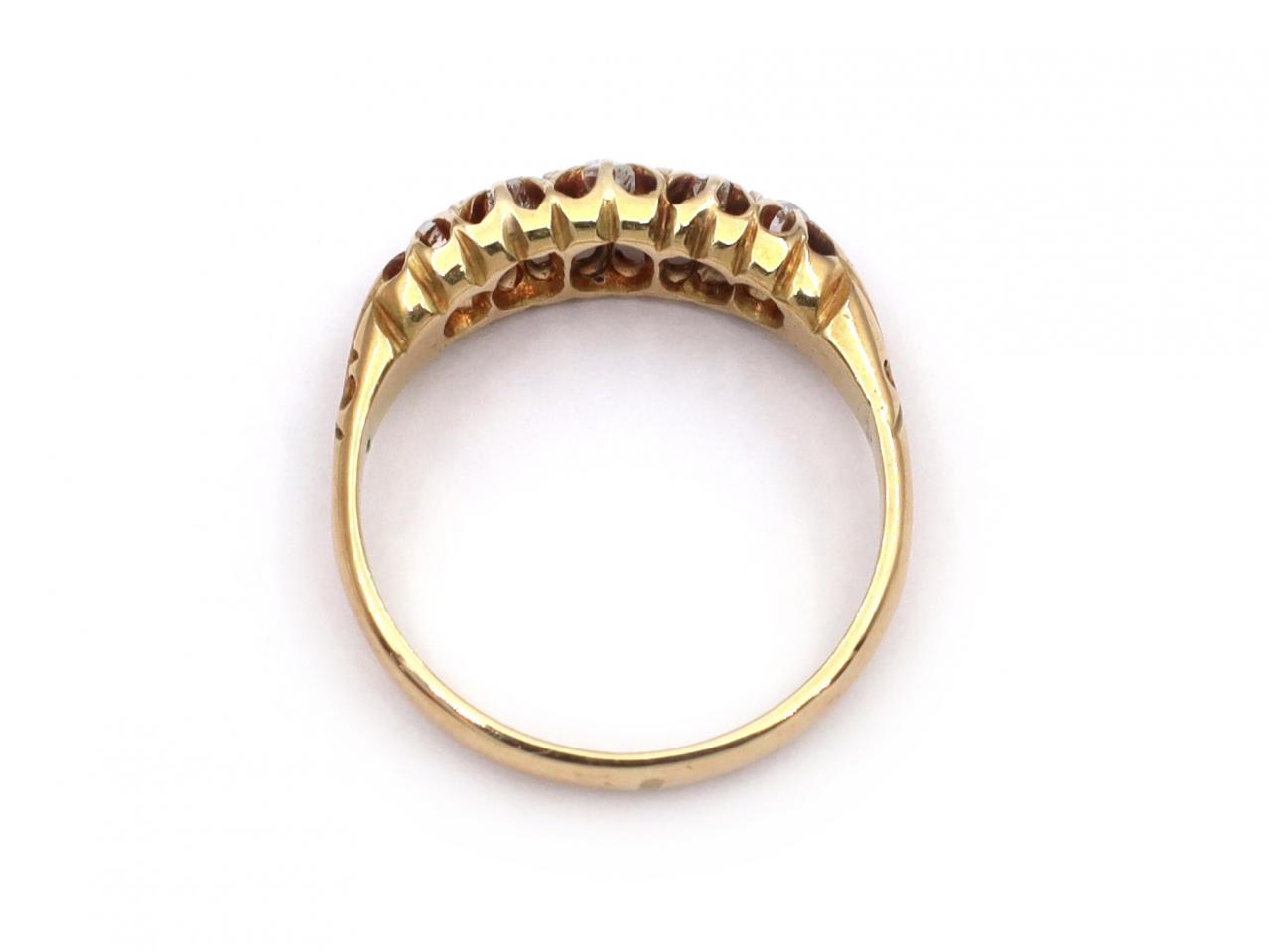 Antique graduating five stone diamond ring in 18kt yellow gold. Set across the finger with five cushion shape Old Mine cut diamonds in claw settings, to an intricately carved five stone design with curving claws, integrated shoulders decorated with incised details before smoothing to a solid shank. Hallmarked 18kt gold, Chester.