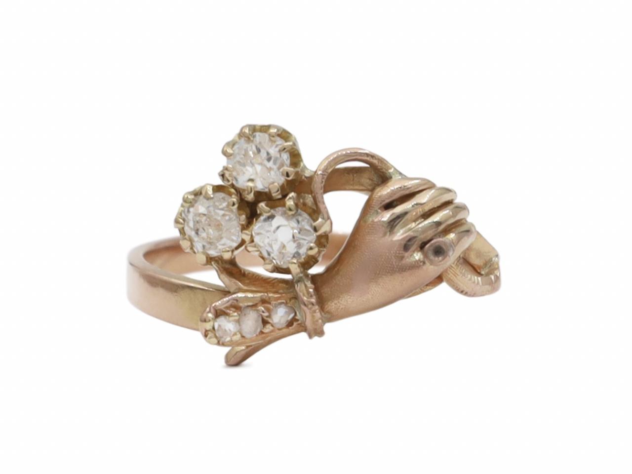 Antique hand and clover diamond ring in 18kt rose gold. Set with three cushion shape Old Mine cut diamonds in claw settings, to a three stone shamrock design held by the stem with a delicate gold hand featuring a ring to the pointer finger and a rose cut diamond set cuff, terminating to either side with a solid shank.