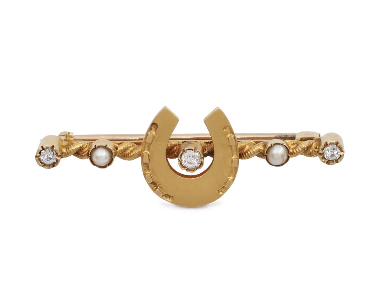 Antique horseshoe diamond and pearl bar brooch in 18kt yellow gold. Marked 18kt gold.