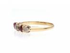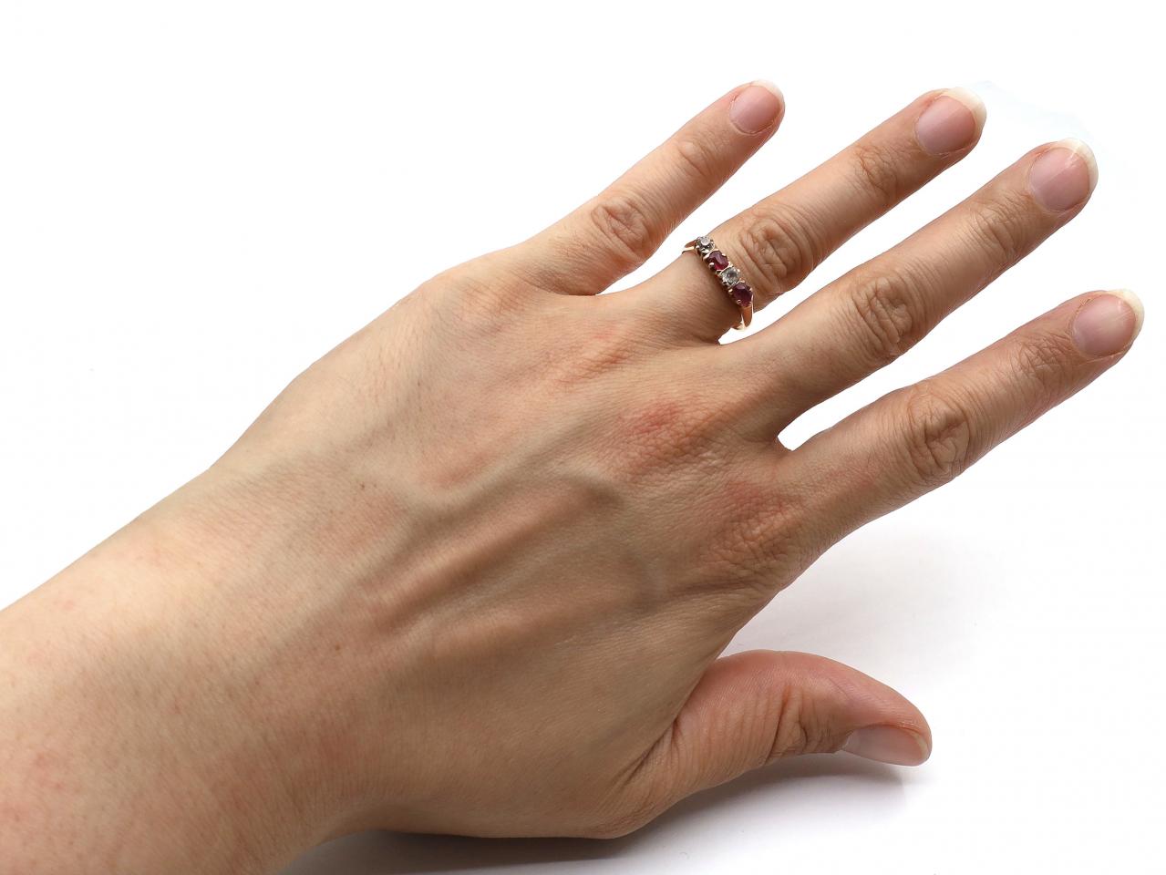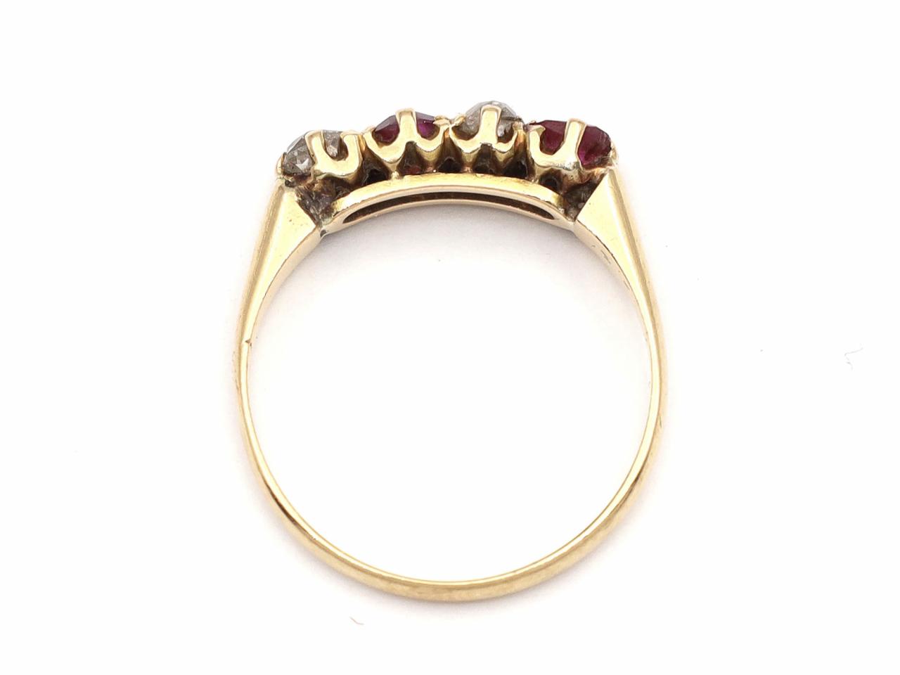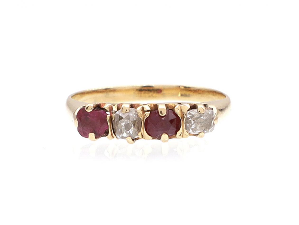 Antique Iberian four stone ruby and diamond ring in 18kt yellow gold. Set with two cushion shape Old Mine cut diamonds in claw settings, alternating with two cushion shape mixed cut rubies in claw settings, to a horizontally set four stone design with curving claws, pierced gallery and flanked to either side with trumpeting shoulders which flow to a slim shank.