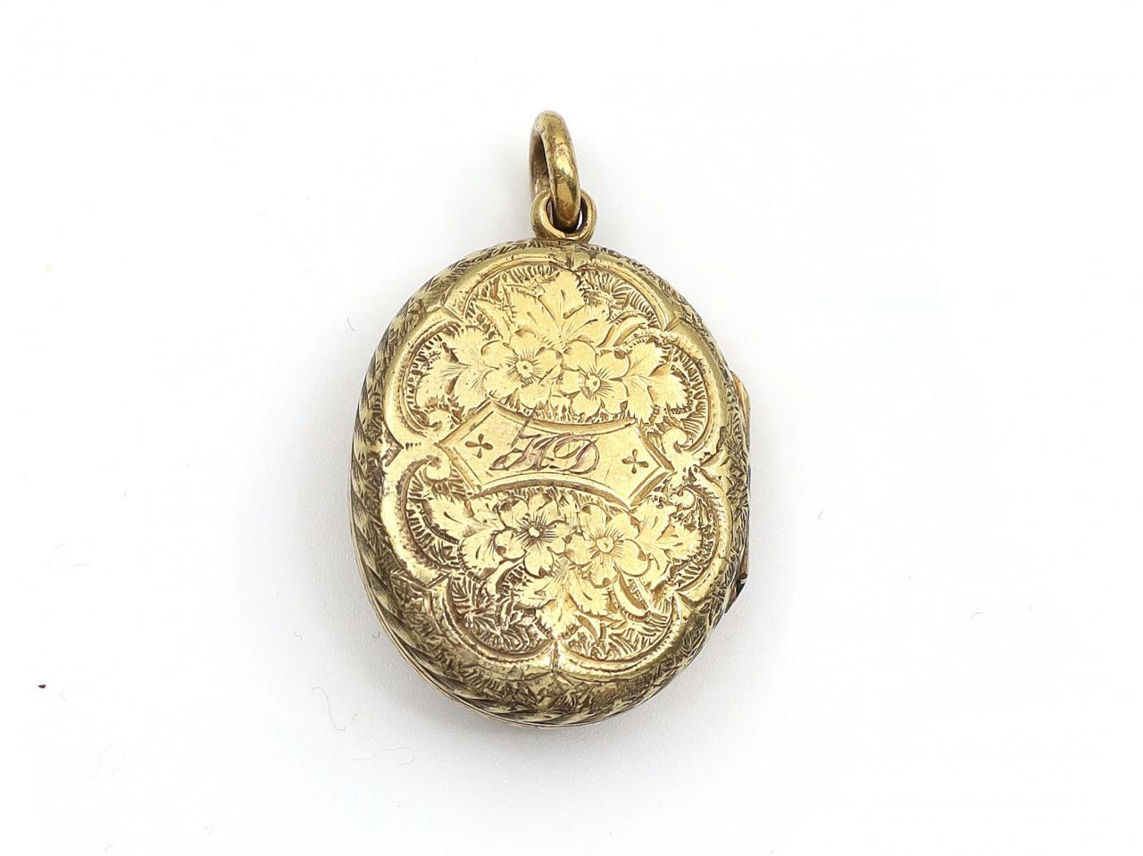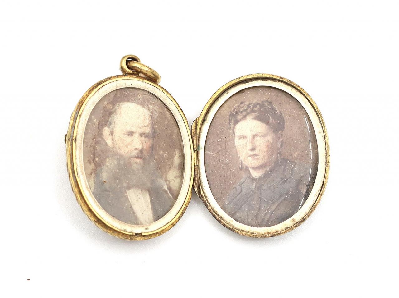 Antique Irish harp locket set with emeralds in 15kt yellow and green gold. An oval locket decorated to the front exterior with a carved harp motif set with three old cut emeralds, surrounded carved green gold shamrock motifs and textured gold, the reverse exterior engraved to the centre with the initials 'H.D.' with flower and decorative leaf motifs, the hinged locket opens to reveal two original photographs of a bearded gentlemen and a stern lady with braided hair, fitted to top with a circular bale.