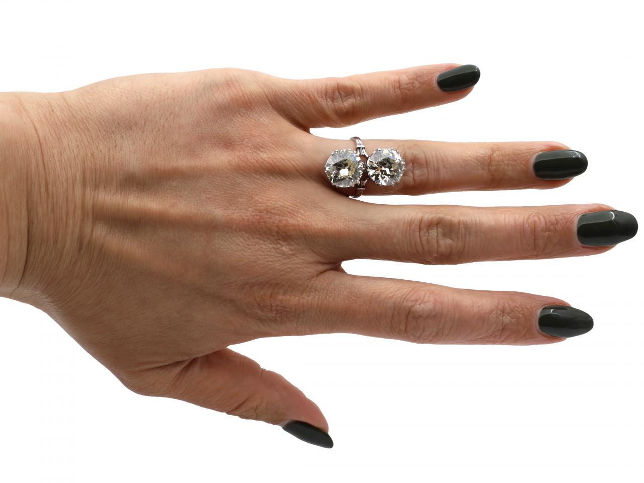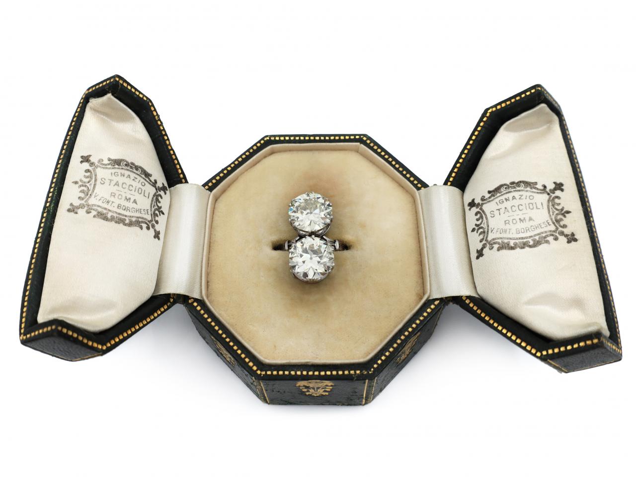 Antique Italian two stone diamond convertible ring and earrings in platinum. A convertible ring set to top with an estimated 3.85ct round Old European cut diamond in a fancy split claw setting, set to bottom with an estimated 3.95ct round Old European cut diamond in a fancy split claw setting, to a vertical two stone design featuring intricate claws, finely pierced collets and met to either side with open split shoulders which terminate to a raised terminal before smoothing to a solid shank, the collets are fitted with tension button which clip into place to hold the collets in place securely, each diamond can be removed and fit to the centre of the diamond drop earrings.