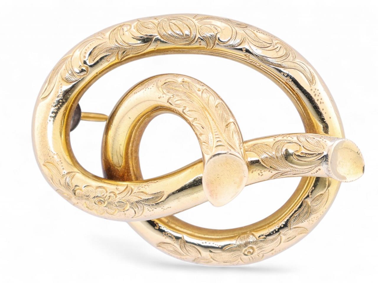 A Victorian antique brooch of knotted design, finely engraved throughout with foliate detailing. Crafted in 18kt yellow gold (tests as 18kt).