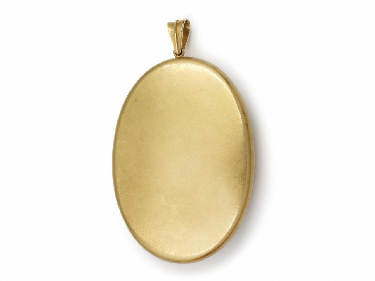 Antique large oval pendant set with freshwater pearls, rubies and diamonds in 18kt yellow gold. A heavy oval pendant in 18kt yellow gold centred with a row of freshwater pearls, encircled by a row of round mixed cut rubies in rubover settings, further highlighted by a row of freshwater pearls and highlighted by a row of round Old European cut diamonds in platinum millegrain settings, to a polished oval pendant fitted to top with a ribbed tapered bale.