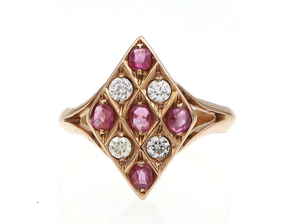Antique lozenge shape crisscross ruby and diamond cluster ring in 18kt rose gold. An angular cluster set with alternating rows of cushion shape mixed cut rubies in grain settings and round old cut diamonds in grain settings, decorated with raised diagonal borders and sweeping scalloped gallery, the open trumpeting shoulders join to a solid shank. Hallmarked 18kt gold, French.