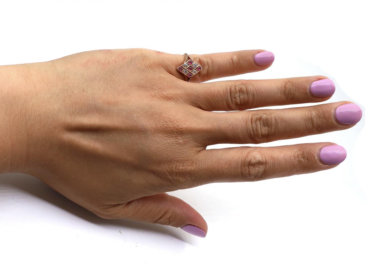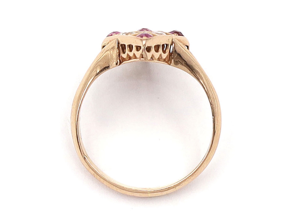 Antique lozenge shape crisscross ruby and diamond cluster ring