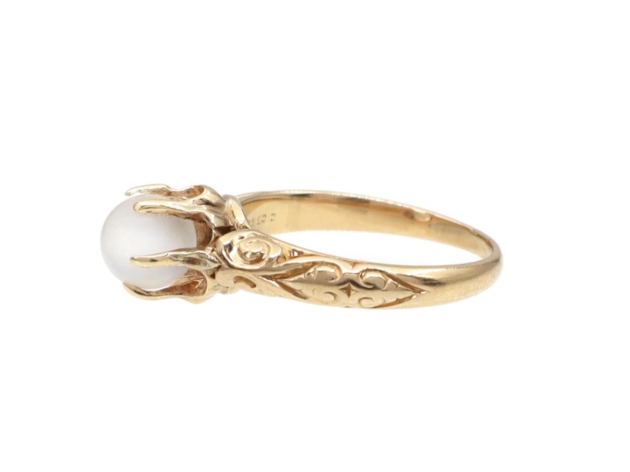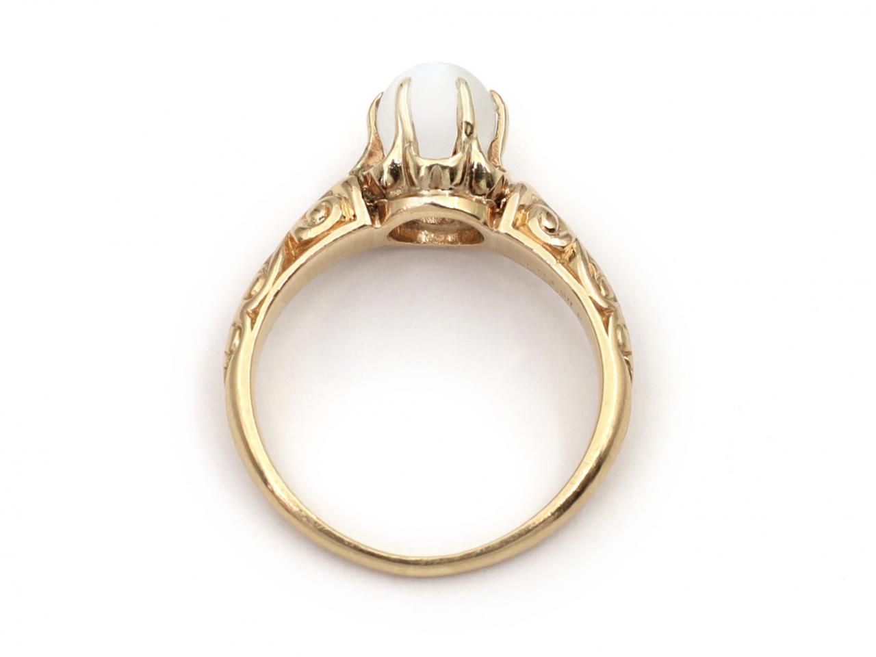 Antique moonstone globe ring in carved 14kt yellow gold. Set with a spherical moonstone orb raised in an elaborate claw setting, flanked to either side with ornately carved shoulders which terminates to a polished shank.