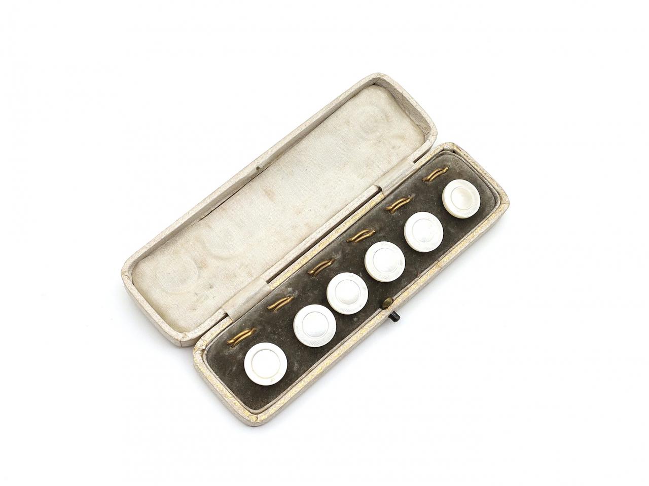 Antique mother of pearl button dress set. A matching set of six dress shirt buttons and base metal keepers. Accompanied by original antique box.