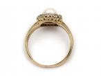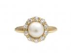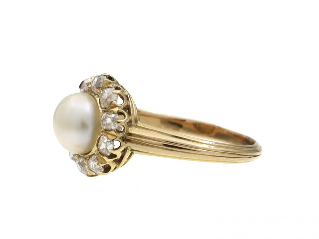 Antique natural pearl and diamond circular cluster ring in 18kt yellow gold. Set with a natural saltwater pearl, encircled by a single row of cushion shape Old Mine cut diamonds in claw and grain settings, to a coronet cluster design featuring curving claws, pierced open gallery and ribbed base, flanked to either side with trumpeting shoulders decorated with horizontal incised linear details that continue and taper to a polished shank. Estimated total diamond weight 0.50cts.