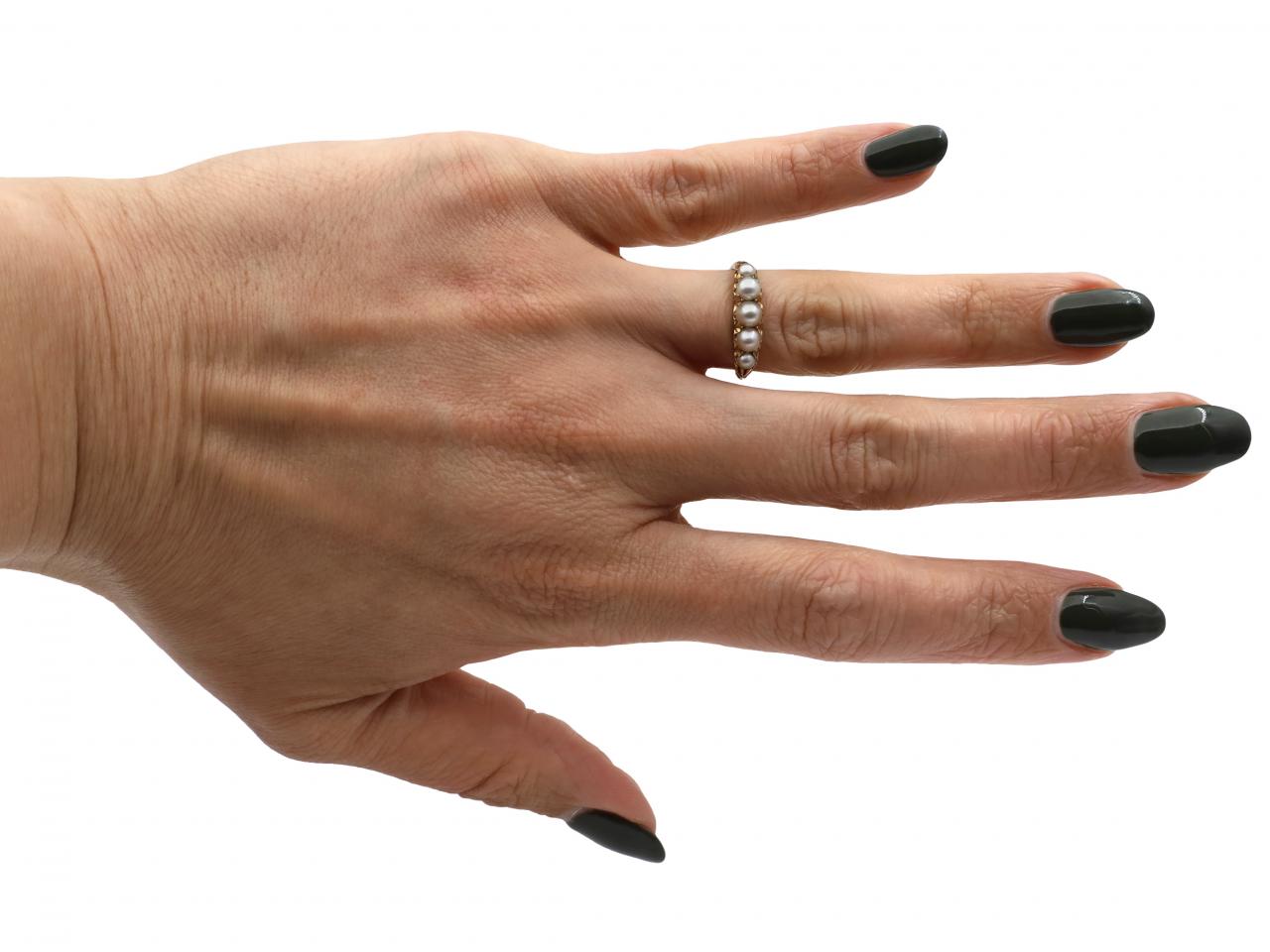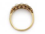 Antique natural pearl five stone carved ring in 18kt yellow gold. Set across the finger with five natural pearls in fancy claw settings, to a graduating five stone design featuring elaborately carved gallery with double scrolls continuing to carved shoulders which taper to a solid shank.