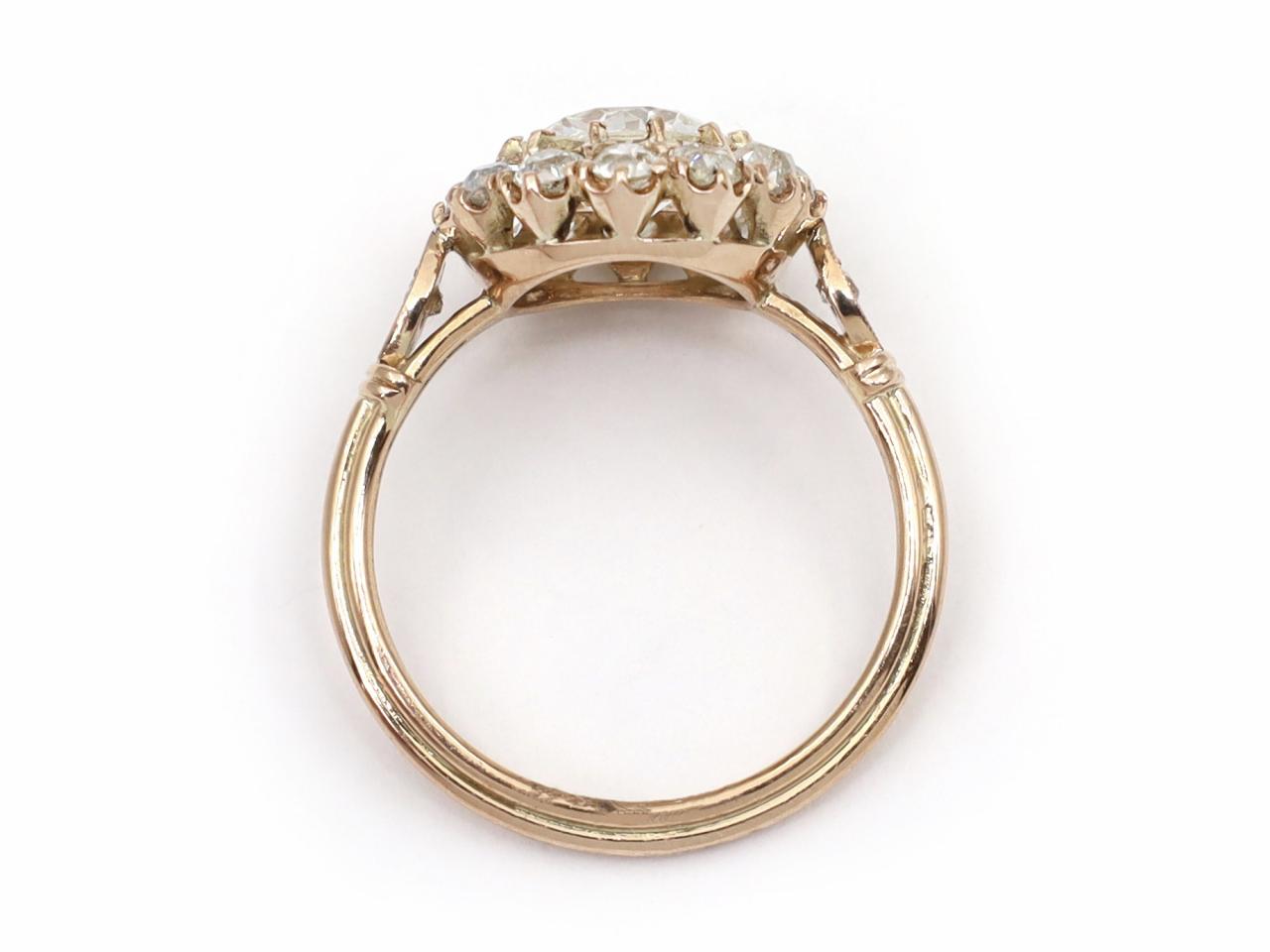 Antique Old European cut diamond coronet cluster ring in 18kt yellow gold. Centrally set with an estimated 1.12ct round Old European cut diamond in a slightly raised claw setting, encircled by a row of round Old European cut diamonds in claw settings, to a circular cluster design with curving claws and pierced open gallery, met to either side with stylised diamond set shoulders with ribbed terminals and fine incised shank.