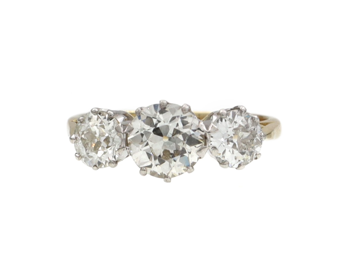 Antique Old European cut diamond three stone engagement ring in 18kt yellow gold. Centred with a round Old European cut diamond in a platinum claw setting, flanked to either side with two round Old European cut diamonds in platinum claw settings, to a graduating three stone design featuring intricate claws and pierced openwork collets, the raised inwardly tapering shoulders are supported by decorative cheniers and curve to a solid shank. Estimated total diamond weight 2.00cts. Hallmarked 18kt gold, Birmingham.