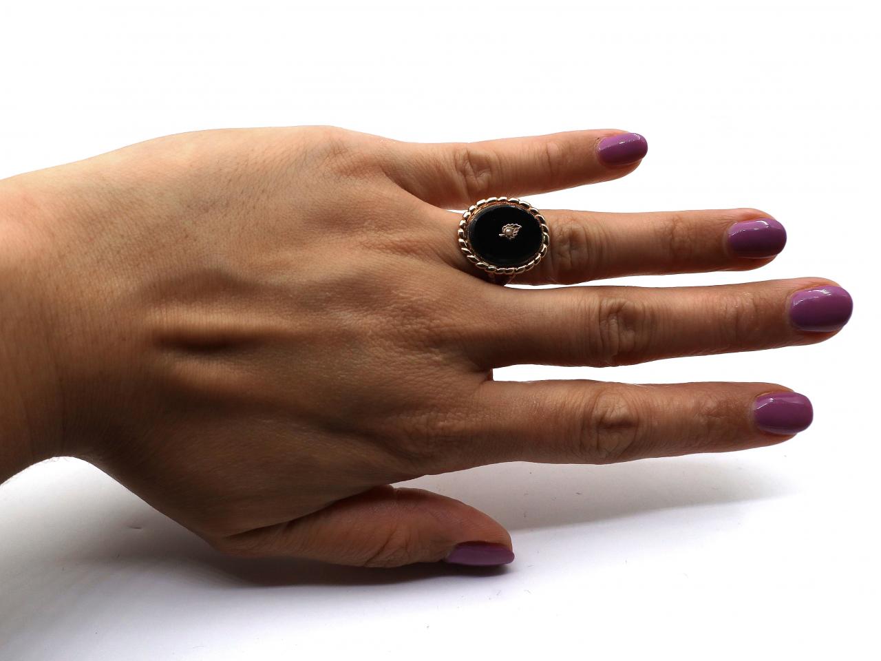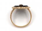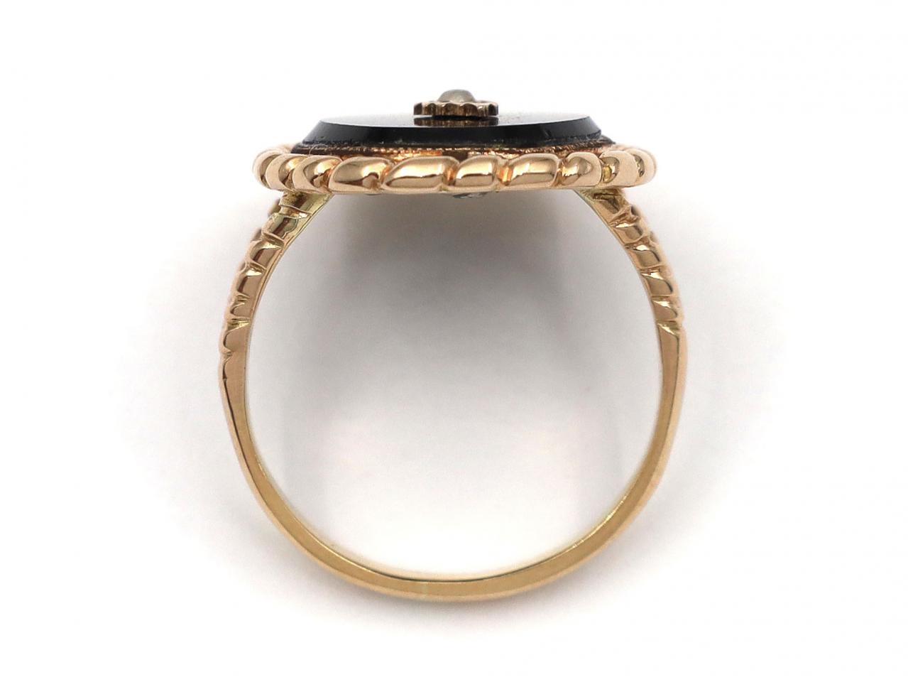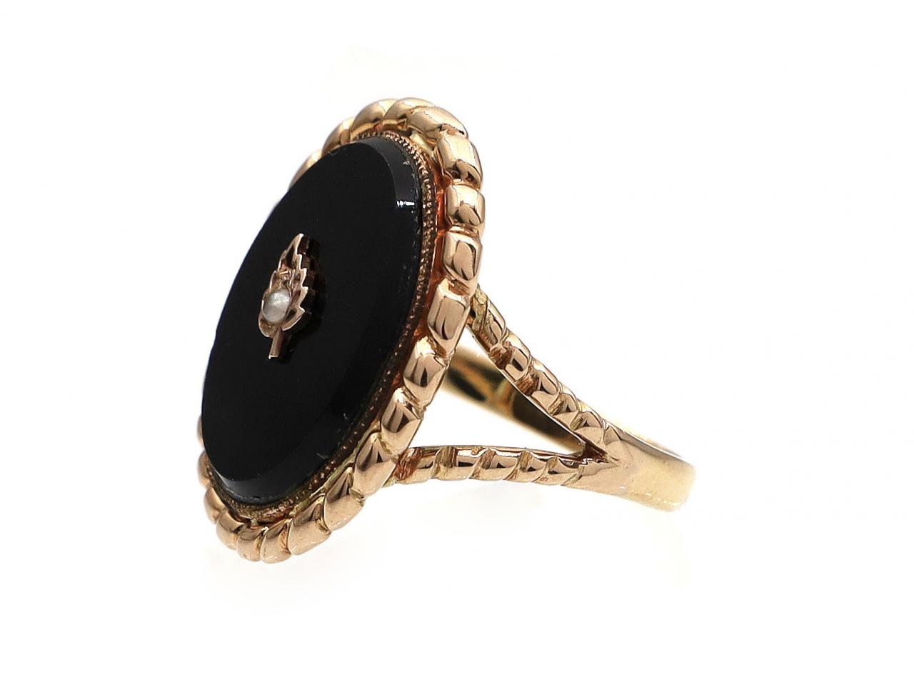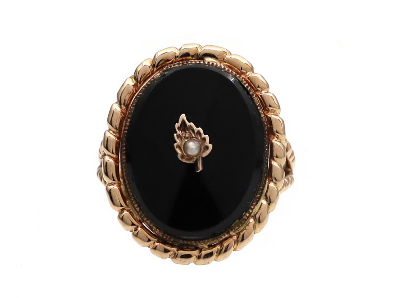 Antique onyx and seed pearl leaf ring in yellow gold. Centrally set with a seed pearl in a grain setting in the form of a leaf, surrounded by an oval tablet inlay of black onyx in a millgrain setting, framed by a rope twist edge and flanked to either side with split rope shoulders that terminate to a solid shank.