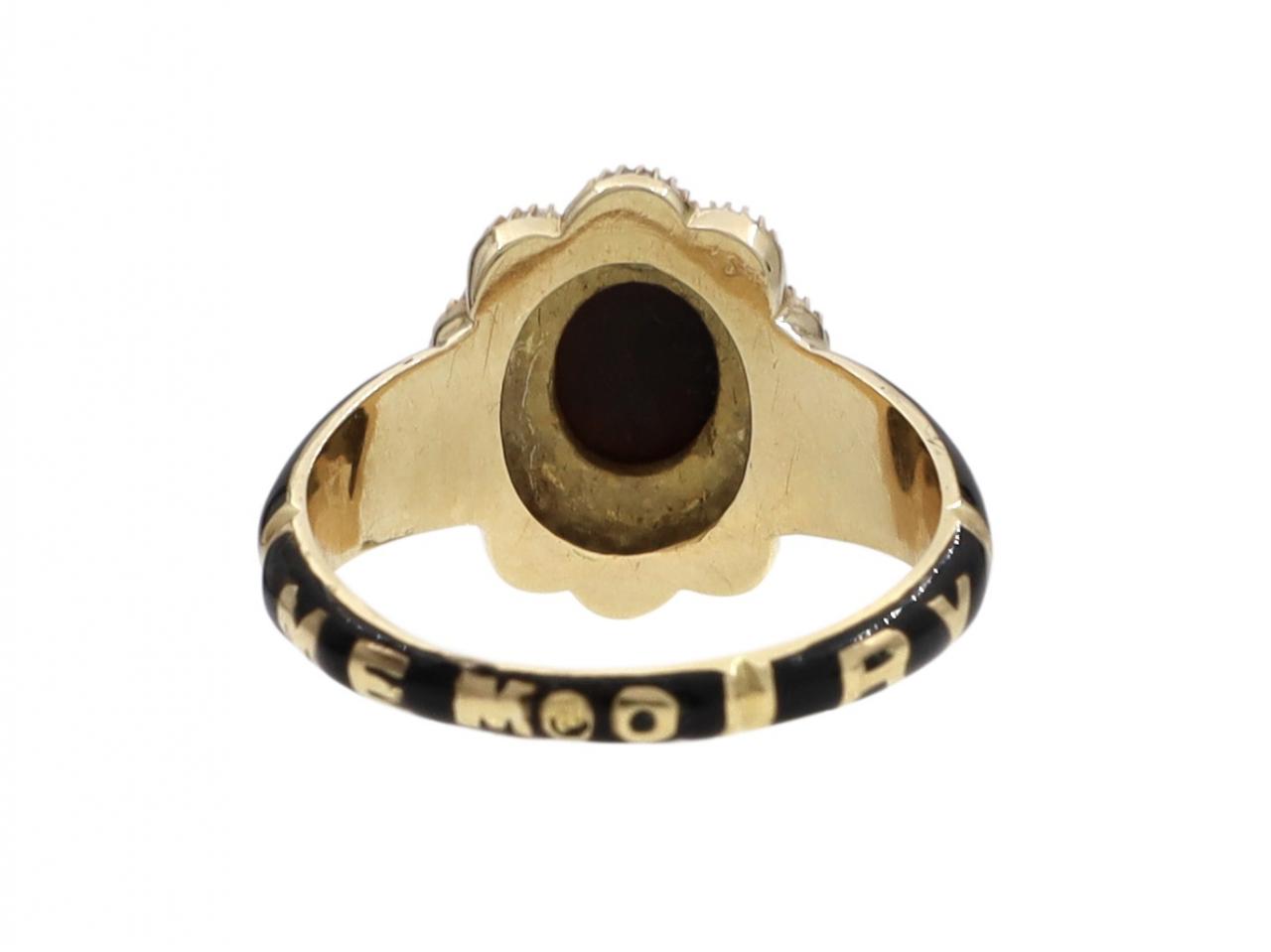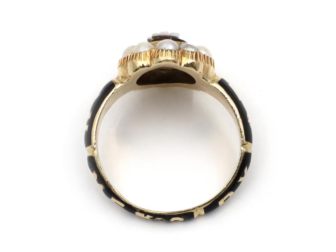 Antique onyx flower cameo, pearl and black enamel memorial ring in 18kt yellow gold. Centrally set with an oval carved onyx cameo featuring a five petal flower motif in a slightly raised rubover setting, encircled by a row of natural pearls in fancy cut down settings, flanked to either side with chunky trumpeting shoulders which taper to a slim shank and decorated with polished gold letters 'IN MEMORY OF' with black enamel in relief. Hallmarked 18kt gold, Sheffield, circa 1840.