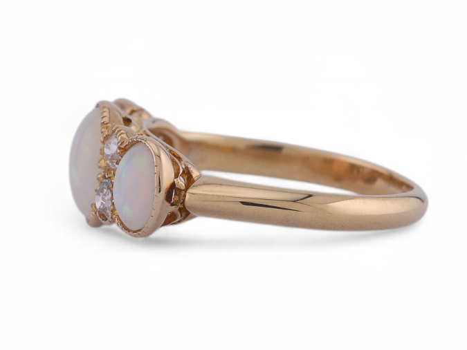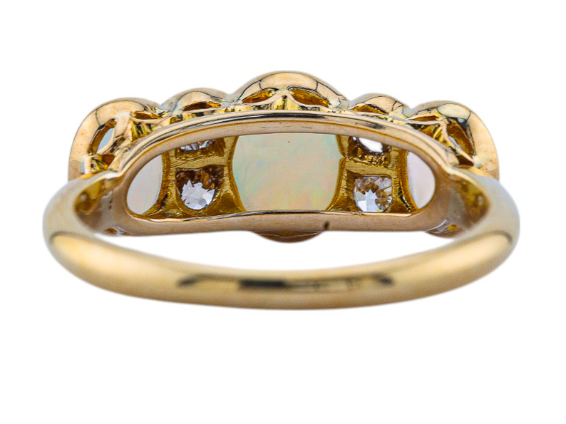 Antique opal and diamond three stone carved ring in 18kt gold. Centred with an oval cabochon cut opal in a claw setting, flanked to either side with four vertically set round shape European cut diamonds in claw settings, further set with two oval cabochon cut opals in claw settings, to a graduating three stone design featuring fine curving claws, openwork gallery, carved detailed shoulders terminating to a solid shank.