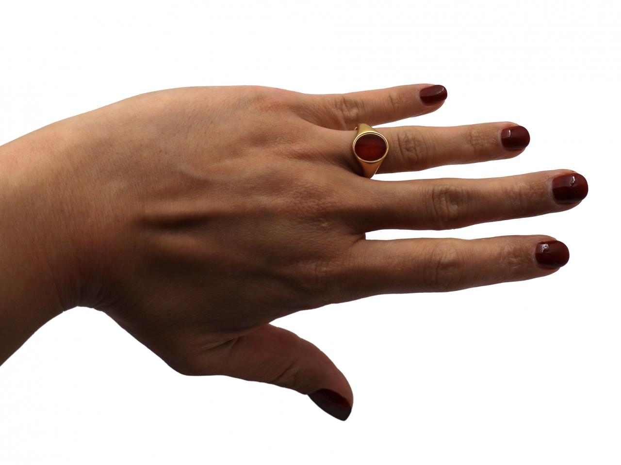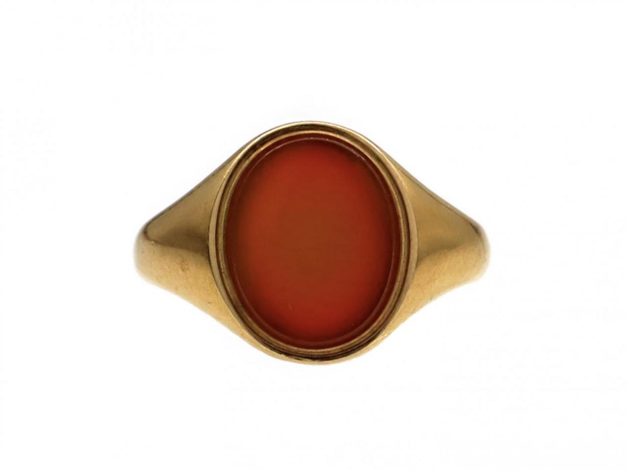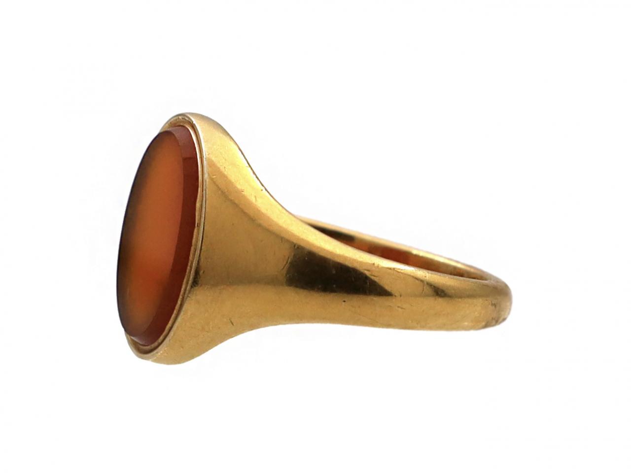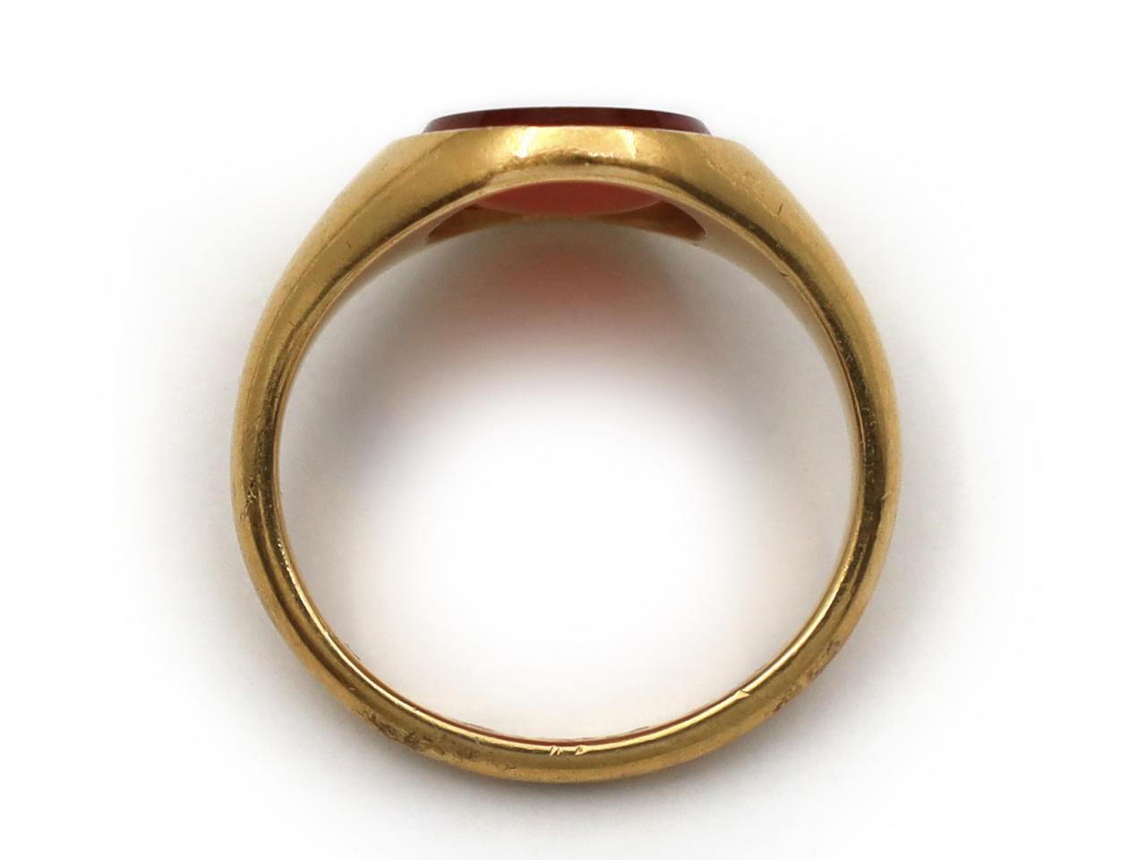 Antique oval carnelian signet ring in 18kt yellow gold. Set with an oval carnelian tablet in a rubover setting, to a oval signet ring with incised frame and broad integrated shoulders that taper and curve to a solid shank.