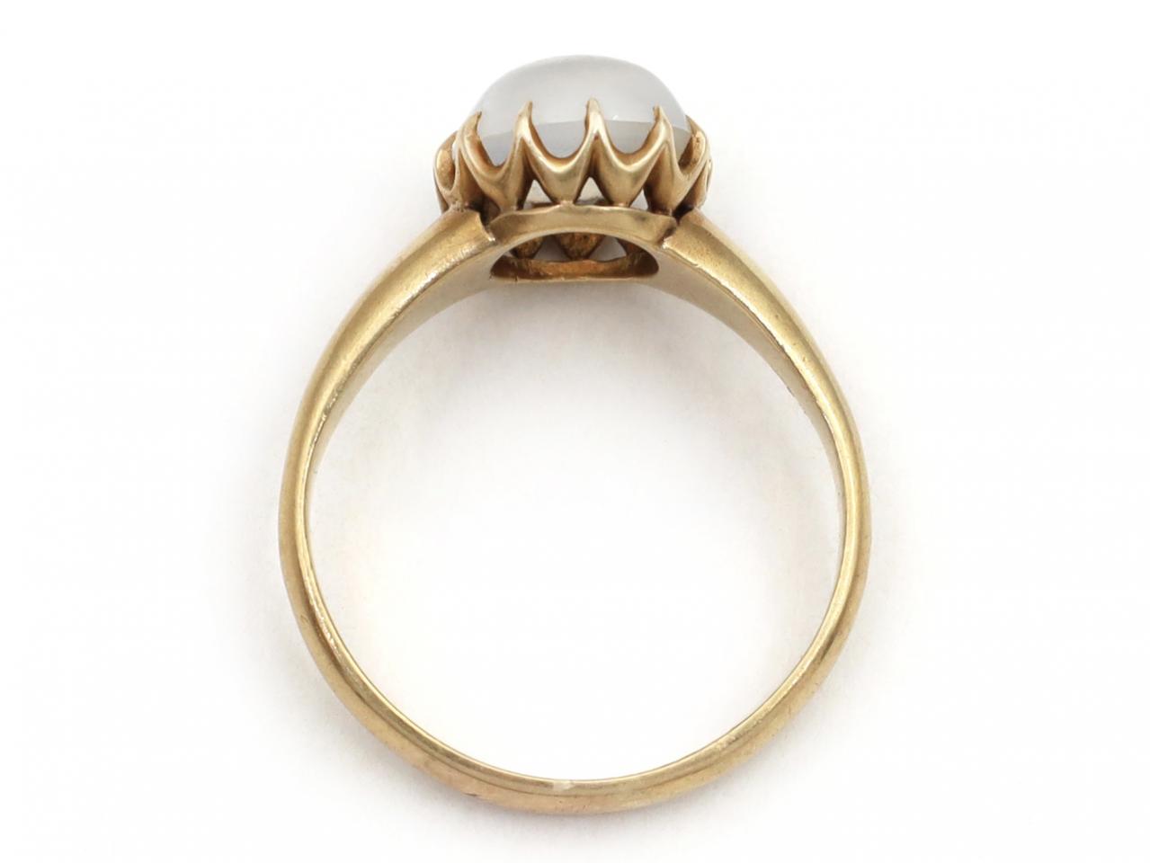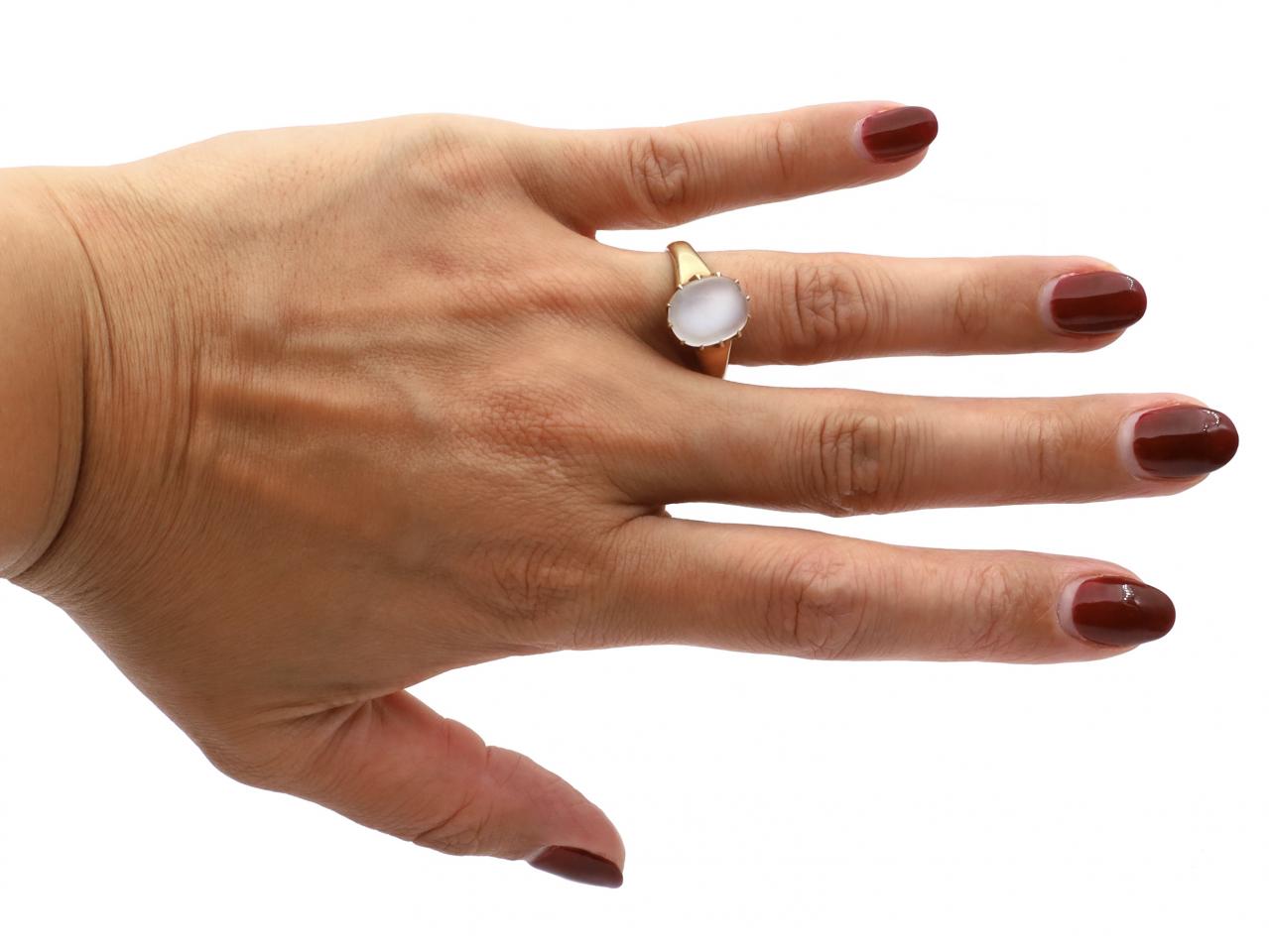 Antique oval moonstone signet ring in yellow gold. Centrally set with an oval cabochon moonstone in a fine claw collet, integrated to either side with broad trumpeting shoulders which curve and taper to a solid shank. Marked 18kt gold.