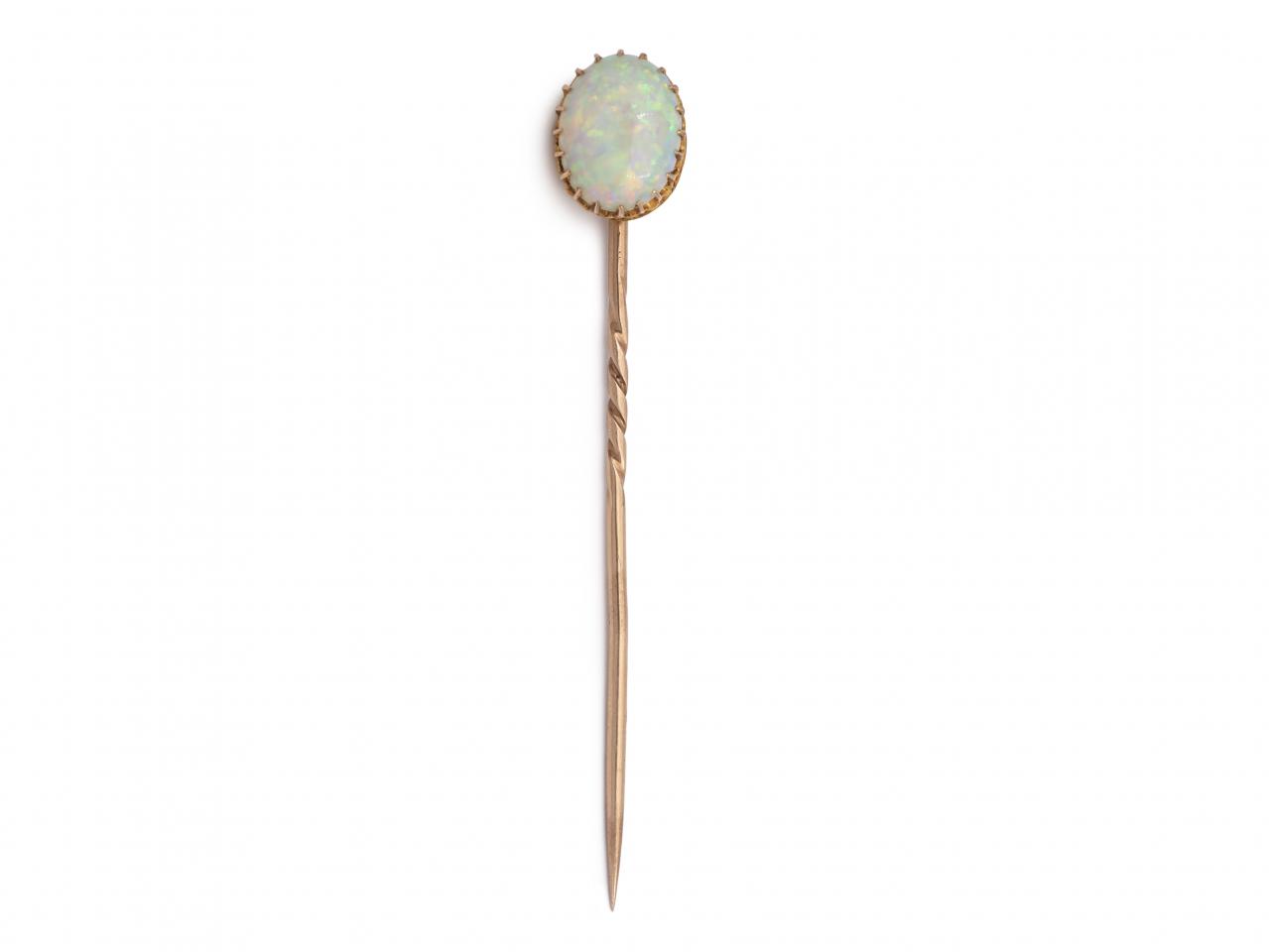 Antique oval opal stick pin in yellow gold. Set with an oval cabochon cut opal in a claw setting, fitted to bottom with a secure pin featuring a barley twist. Tested 15kt gold.